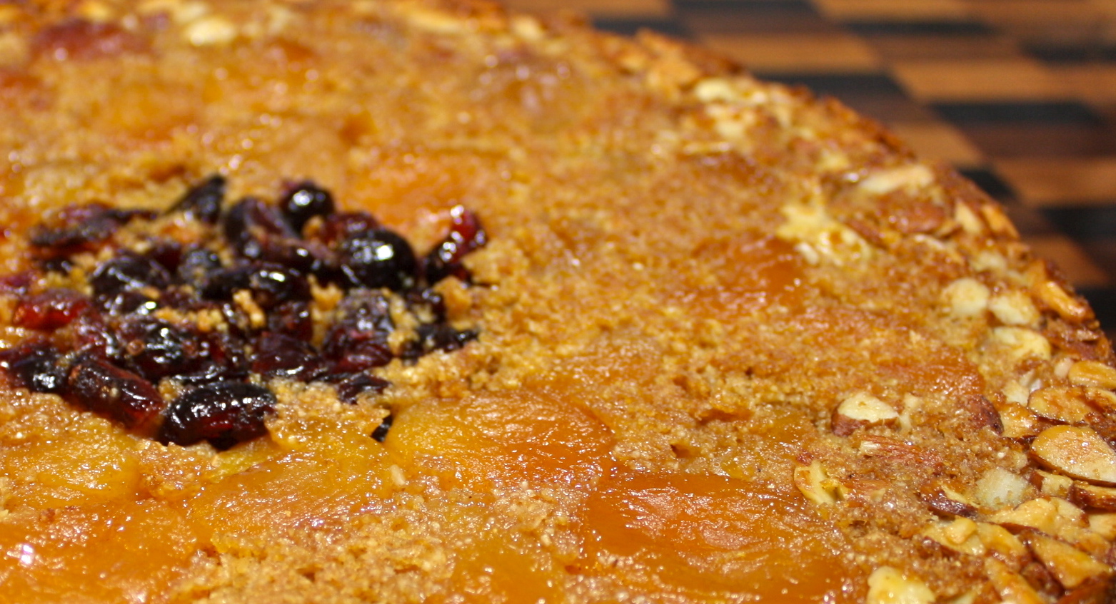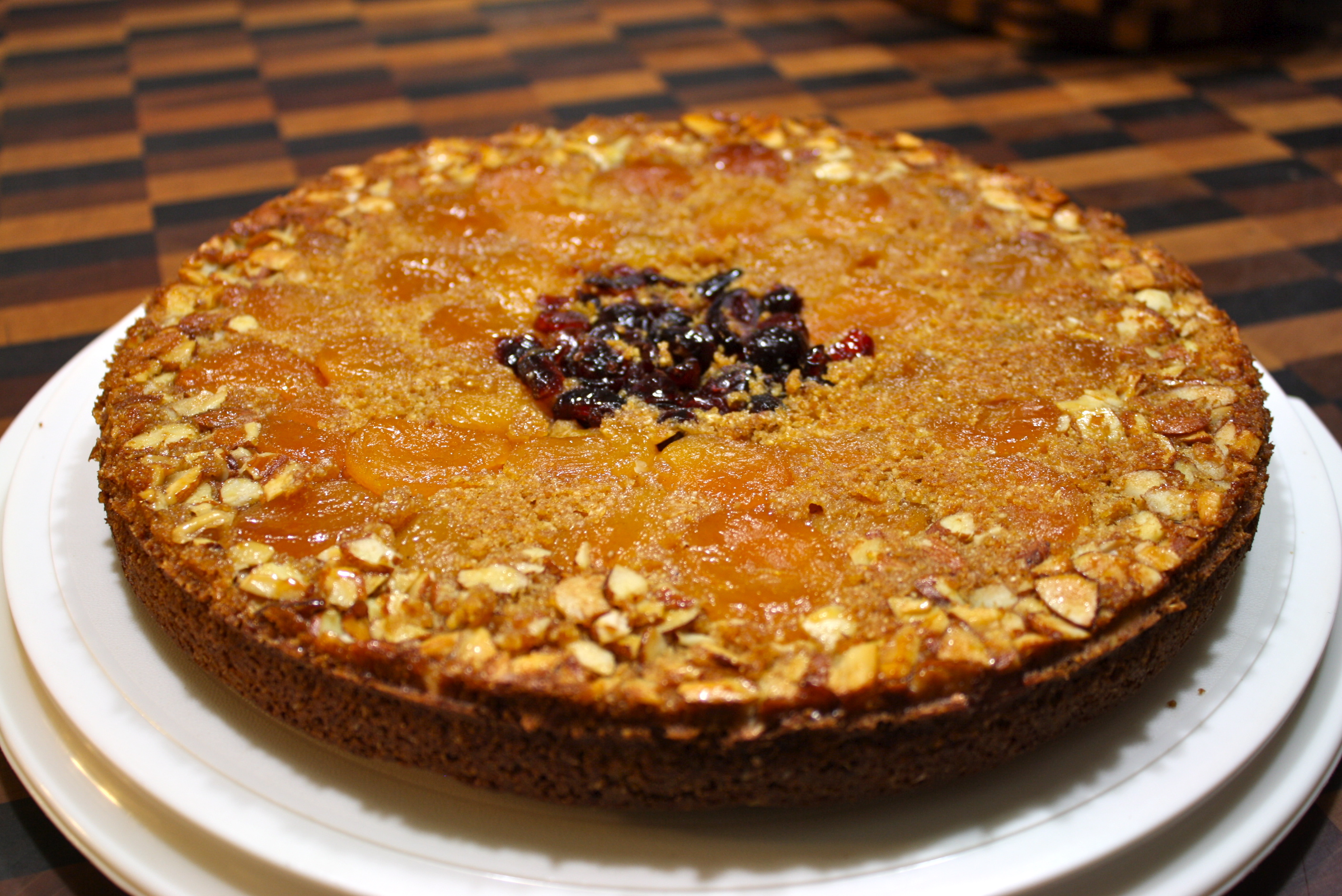 This is best served as a coffee cake for Sunday brunch or as a light dessert after supper. The cake is a buttermilk style cornmeal cake that is moist, but not overly sweet, thanks to the molasses. The apricots take the main stage, but share nicely with the sliced almonds and dried cranberries. Poaching the apricots in fruit juice and a cinnamon stick first soften them even further. A simple cake with an elegant look that holds up well and will keep you full thanks in part to the yogurt and whole wheat for more protein.