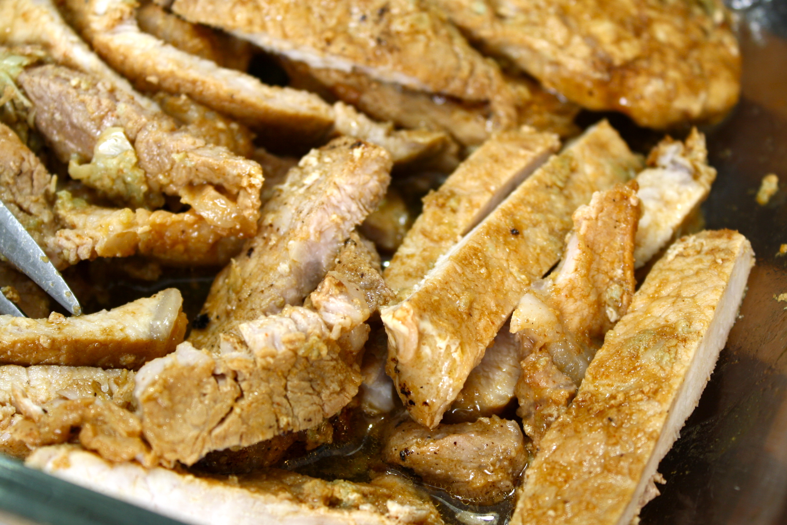 I used pork with beef prices being what they are…$$$. I bought an entire pork loin. I removed the excess fat and silver skin. Sliced the end piece thinly (1/4-1/2 inch thick) till I had about 10-15 pieces. Then I sliced full inch thick chops for another meal and kept the last 7 inch section for a roast for yet a third meal. Wrap and freeze the big chops and roast till needed. Now time for the marinade.