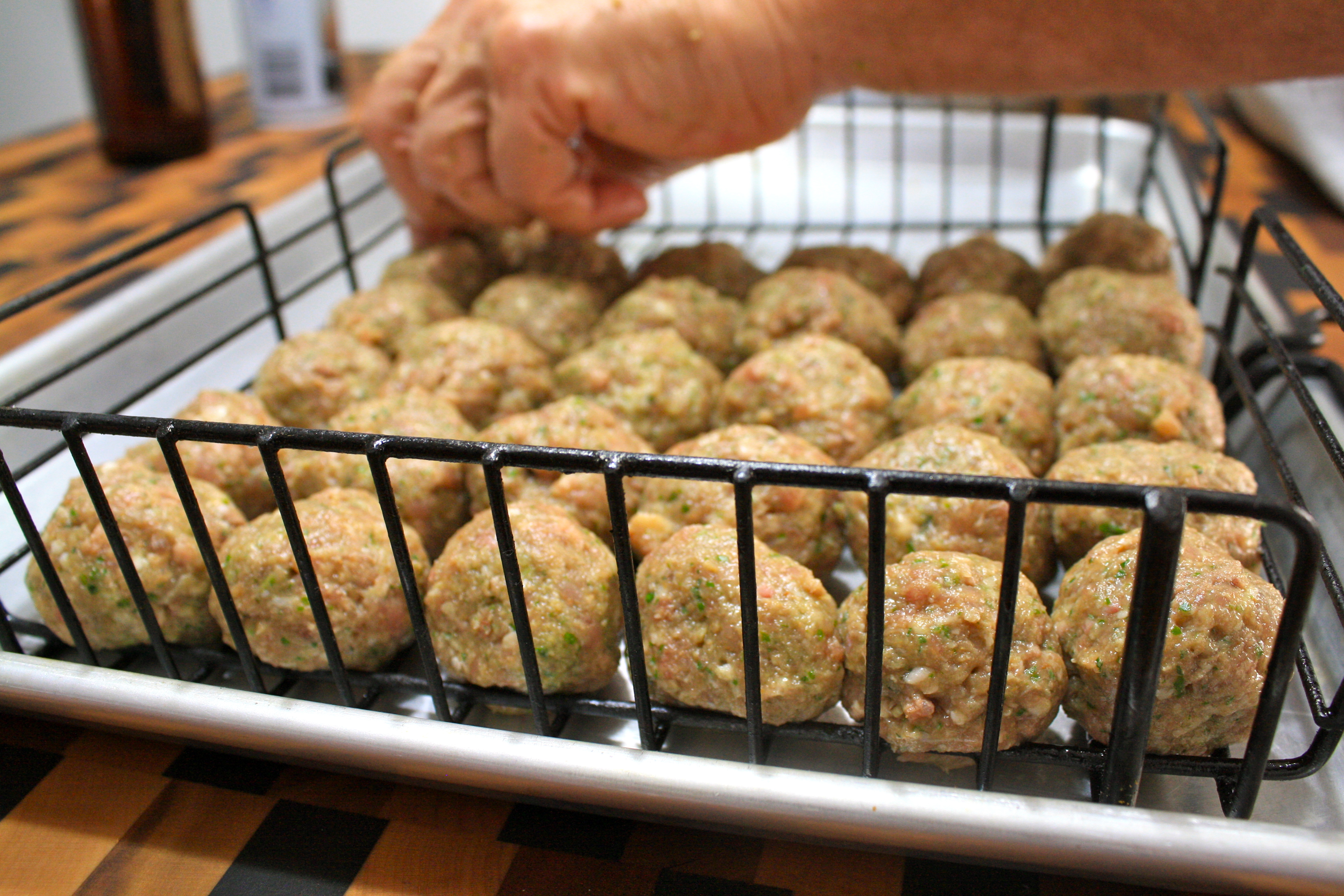 Mix with hands until well combined.(if mixture is too wet, add some dry breadcrumbs) Shape into 1-1 1/2 inch meatballs. Place in grill basket. Attach lid.