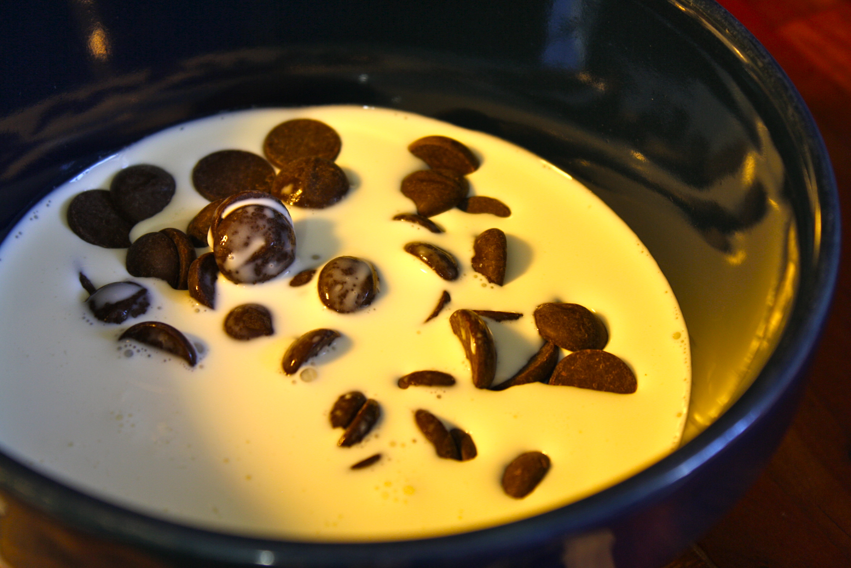 I also wanted to have cinnamon play a part here so I used a cinnamon swirled bread that is almost as rich as a challah bread, but not quite. It gives another layer of flavor that compliments the chocolate. Toasting the bread helps improve adsorption of the liquids and can be done while preparing the other ingredients. Melting the chocolate chips with a bit of cream in the microwave gives you both a sauce to top the pudding with and the chocolate base for the custard.
