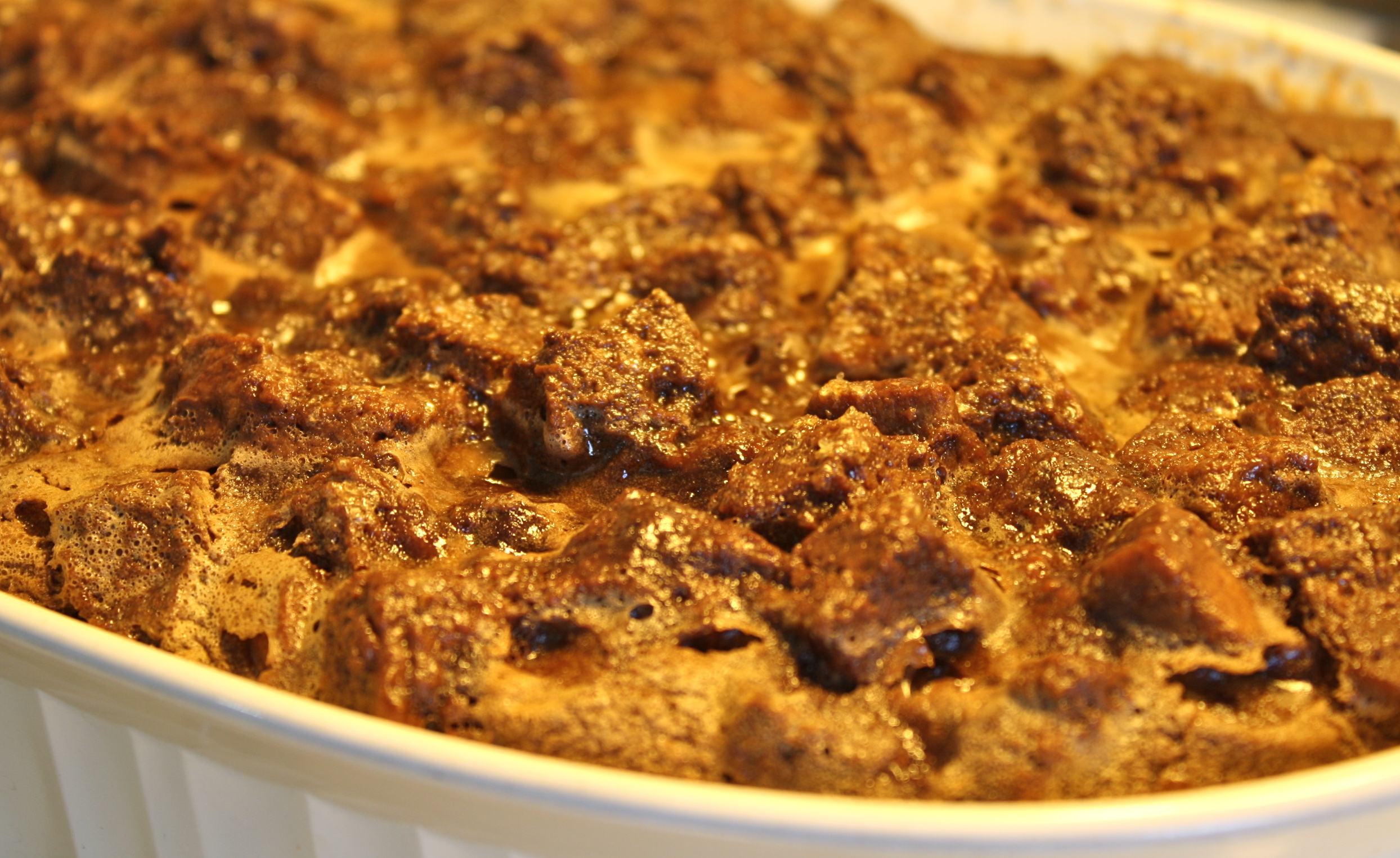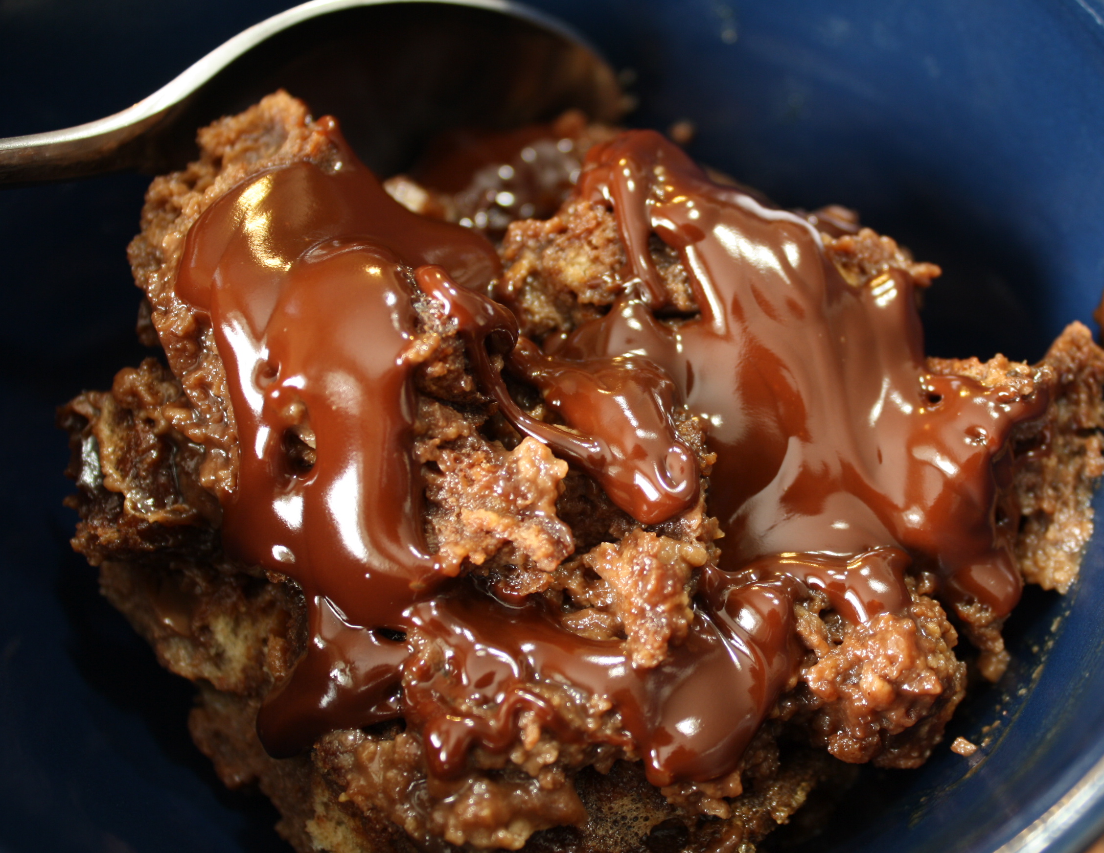 Now that your bread has adsorbed most or all of your cocoa sauce, pour it into a greased 2 quart shallow baking dish. Pour your custard mixture over the top of the bread cubes. Bake for 35-40 minutes until custard is set and top has begun to brown. Remove from oven and allow to stand for another 30 minutes before serving. Serve warm with chocolate sauce (warm sauce for a few seconds in the microwave if needed to liquify). Enjoy!