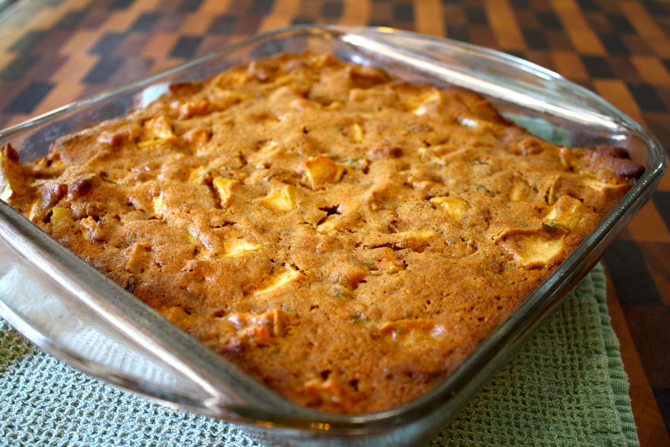 In a medium bowl, combine flour, baking powder, soda, salt, raisins and nuts. In your mixer’s bowl, beat the eggs until light and frothy. Add the honey, apple butter, oil and vanilla. On low speed, add the apples, then the dry ingredients. Mix until just combined. Pour batter into a greased 8 x 8 pan. Spread into the corners. Batter will be thick.