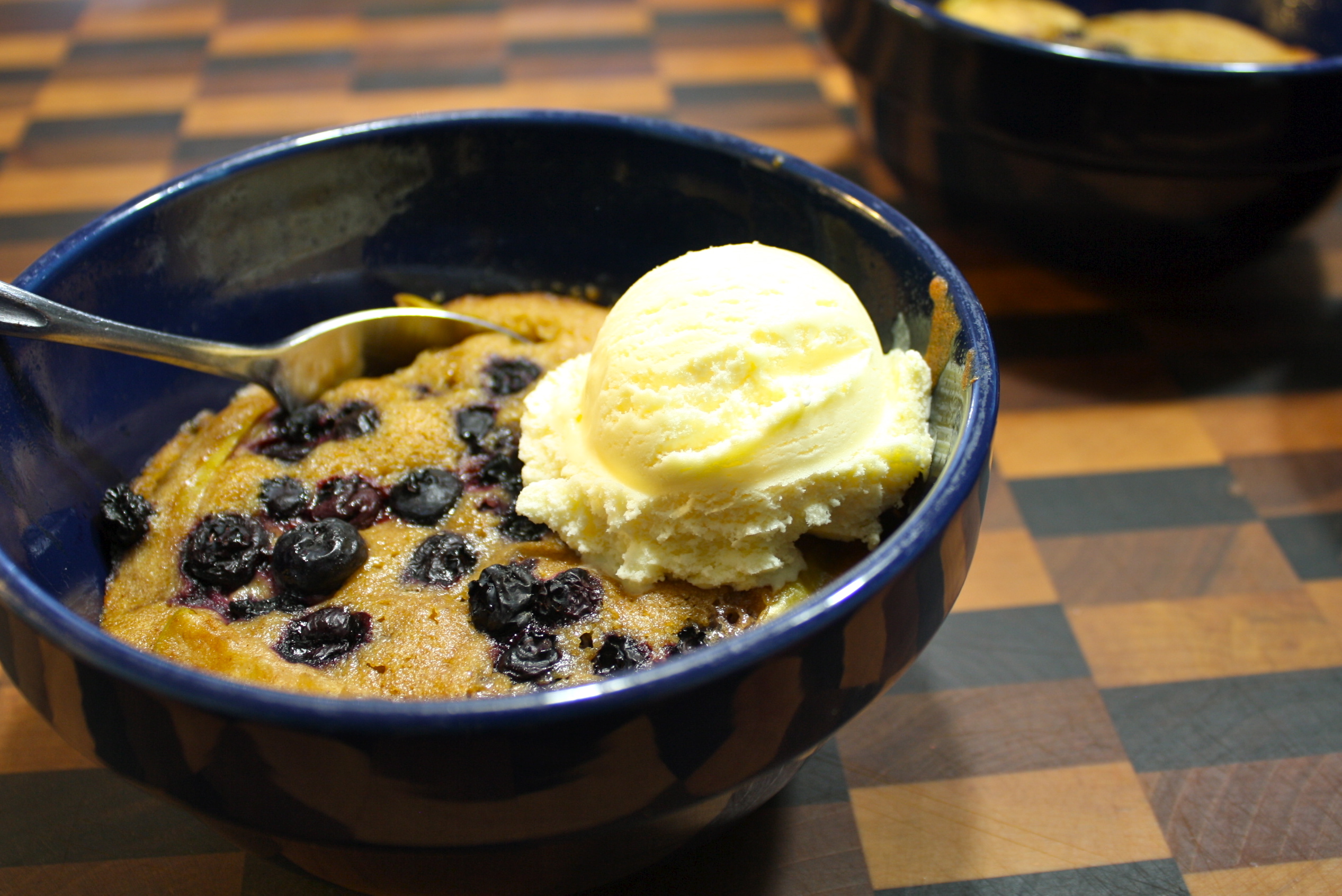 In the bowl that held the dry mix, toss your blueberries with about a teaspoon of sugar. Crush a few of the berries and mix again. Top the batter with berries. Sprinkle each bowl with a bit of sugar (if desired).