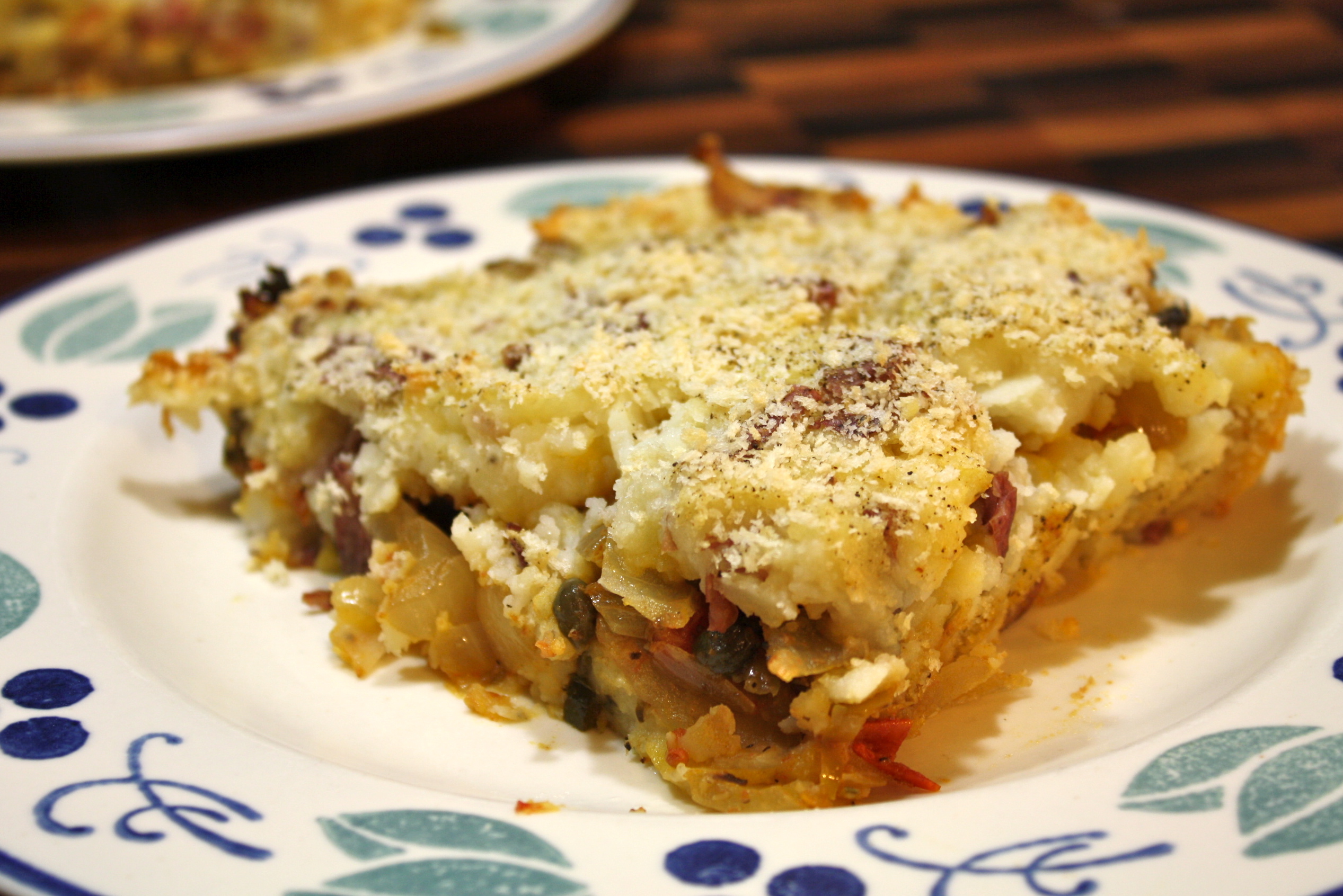 Oil a large casserole dish. Place half of the potatoes in the bottom and spread into an even layer. Spoon filling evenly over the potatoes. Now put the remaining potatoes over the filling. Make spoonfuls on the smaller side to make it easier to spread into a uniform layer without disturbing the filling too much. Use your hands or the back of a large spoon to press it down into a level top. Drizzle with olive oil and lots of fresh ground black pepper. Sprinkle bread crumbs in a thin layer. Bake for 45-50 minutes until top is lightly browned. Serve hot or at room temperature. Enjoy!