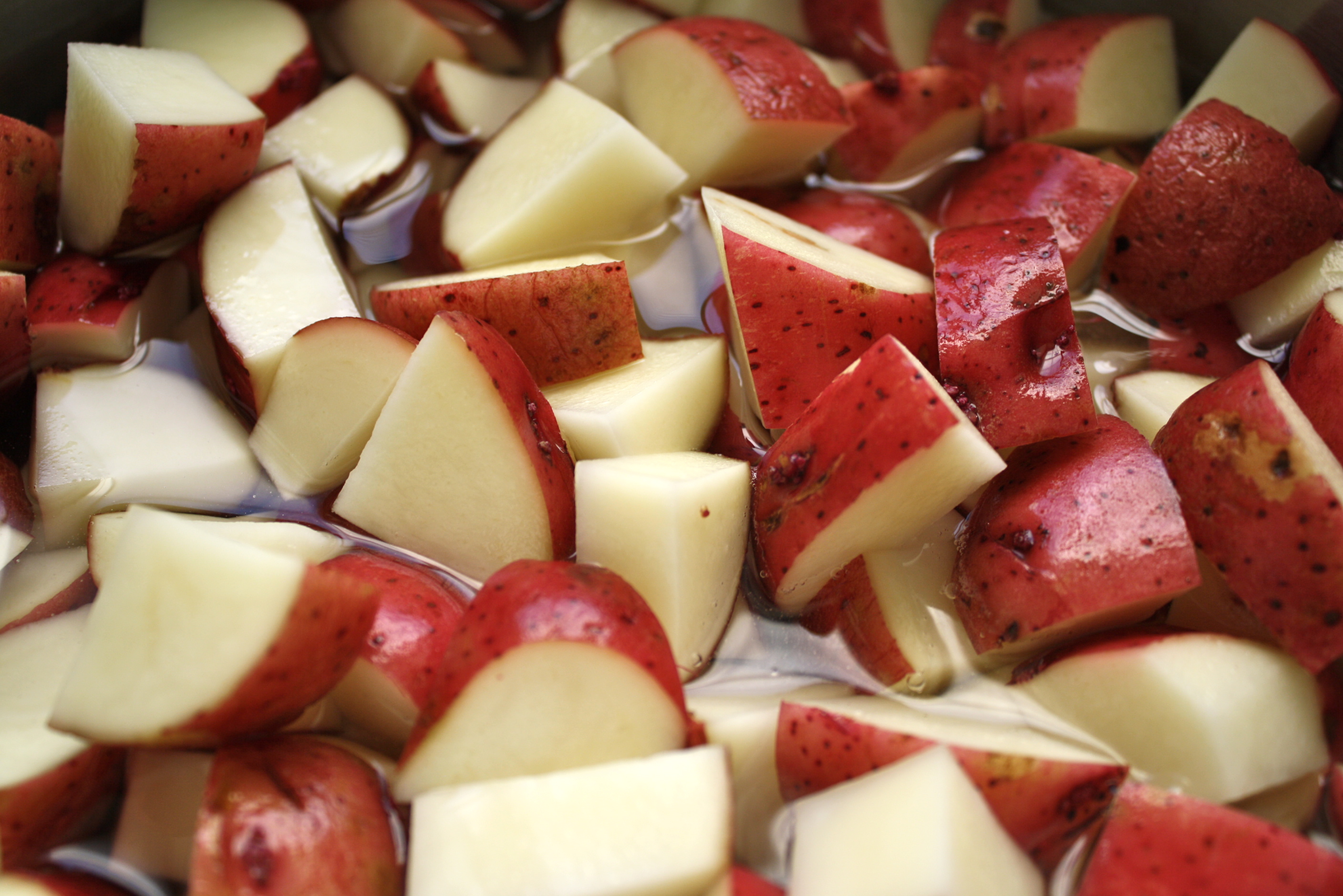 About 3 lbs of waxy potatoes, skins on if you like (and I do) cut into 1 1/2 inch chunks