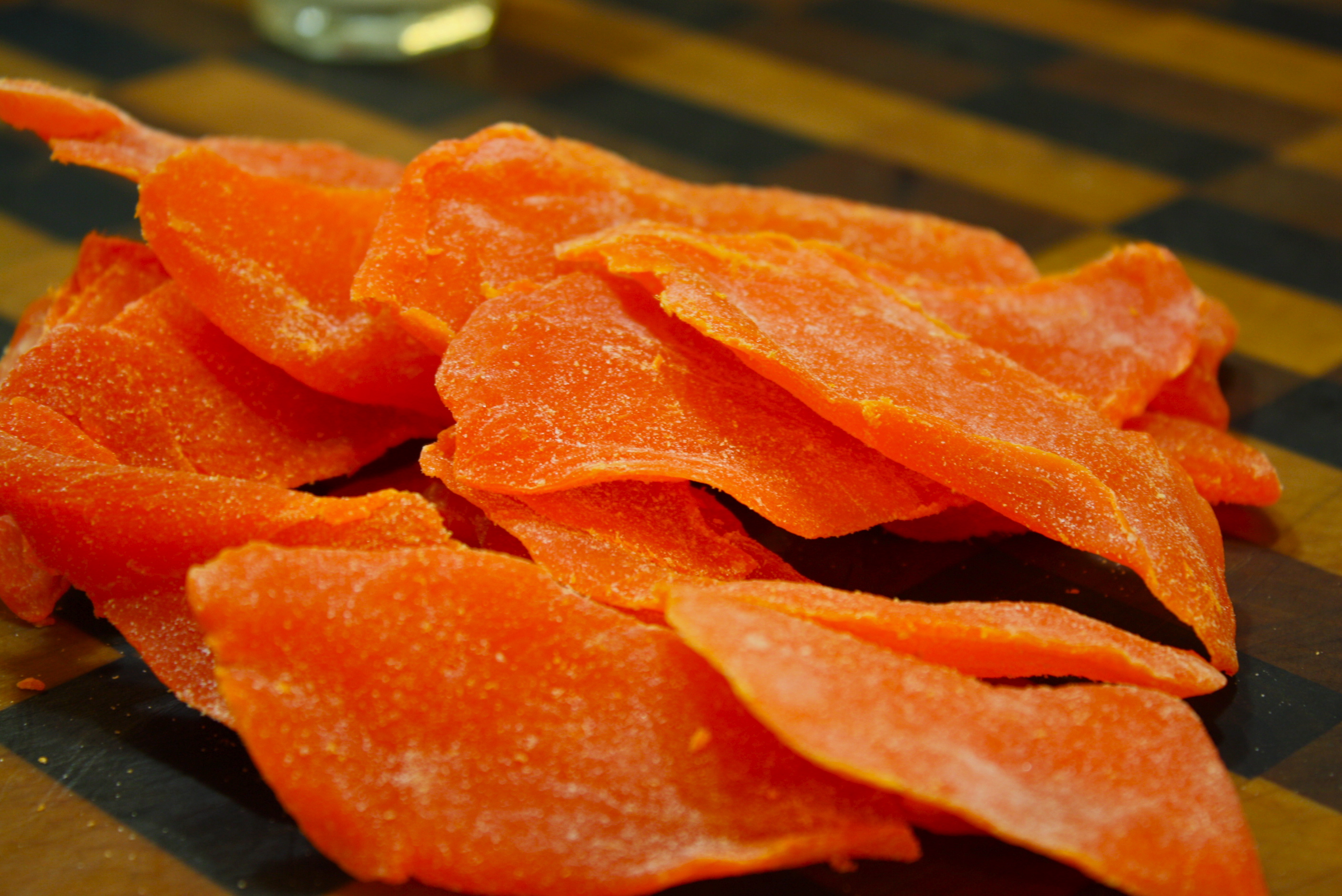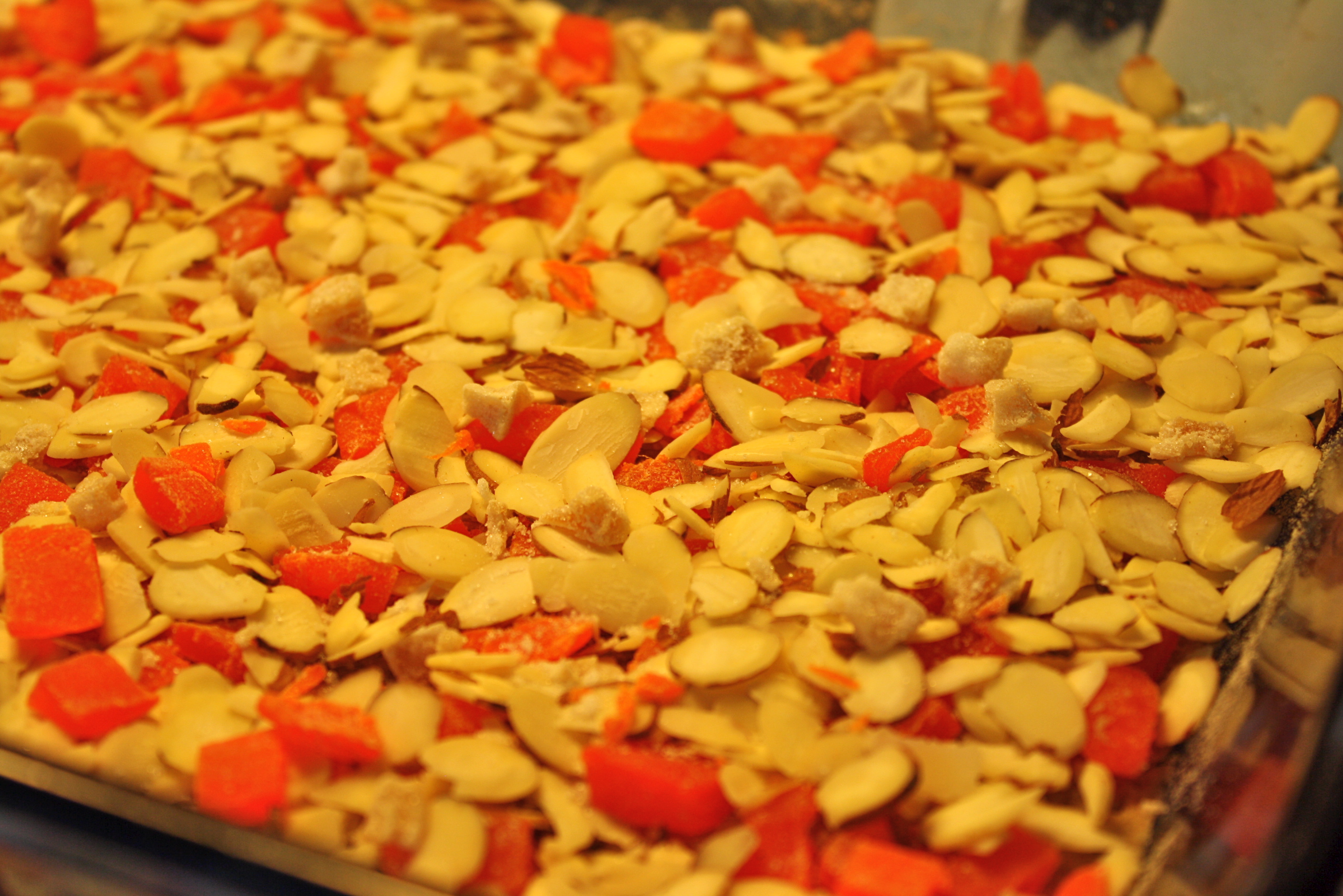 Tasting pieces of mango with different types of nuts lead me to a wonderful combination of mango and almonds. They really go together and make you smile (I sure did!). I decided to try a little ginger with it and found that ground ginger alone didn’t quite give me what I wanted. So I tried crystallized ginger along with a smaller amount of ground ginger. It added just the right note without overwhelming the bar.