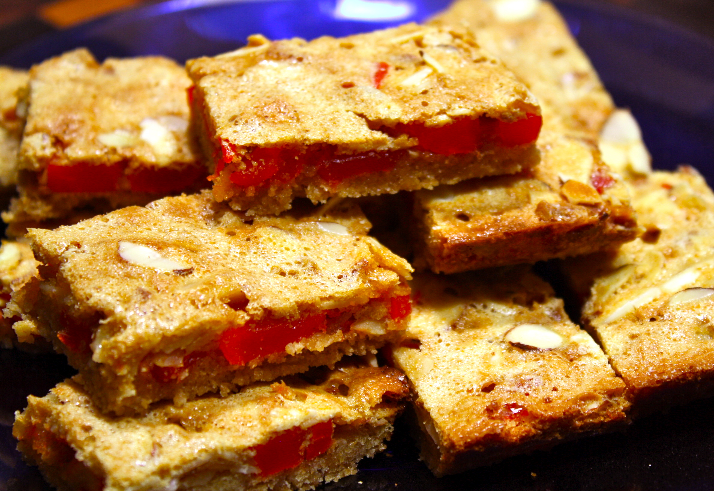 Using your processor again (no need to wash it), make your batter. Add 3 eggs, sugar, vanilla, and juice. Mix for about 20-30 secs. Then add flour, salt, baking powder, and ground ginger and process again for 20-30 secs. Pour batter over fruit and nuts. It makes a fairly thin layer so spread evenly. Bake for 25 minutes until top is nicely browned. Remove and cool in pan before cutting into bars. Try not to nibble on them too much and be sure to save some for your family before giving the rest away.