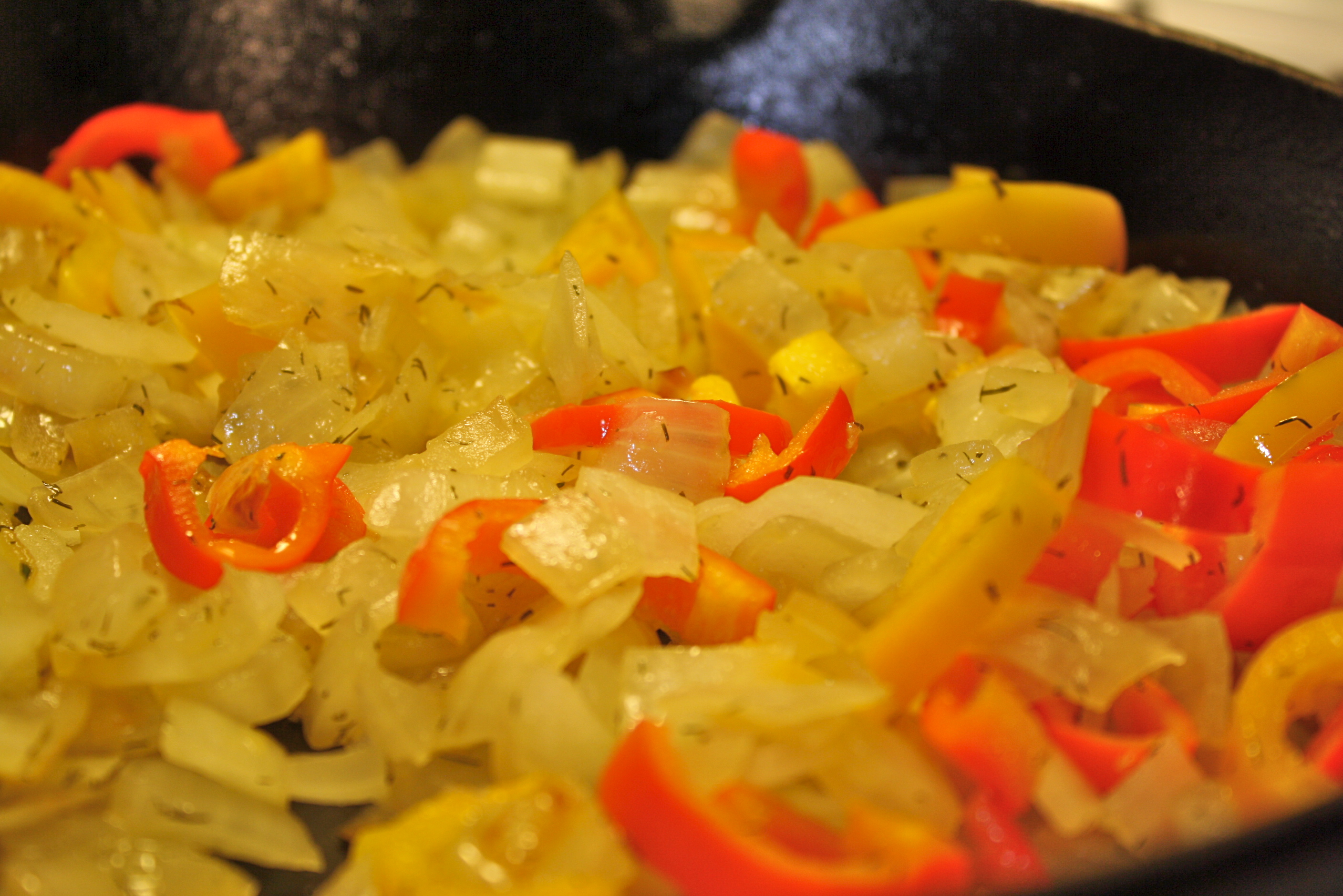 In a medium skillet, saute the onion and pepper over medium heat until golden and soft. Sprinkle with lemon juice and dill and cook until lemon juice is evaporated. Remove from heat and set aside.