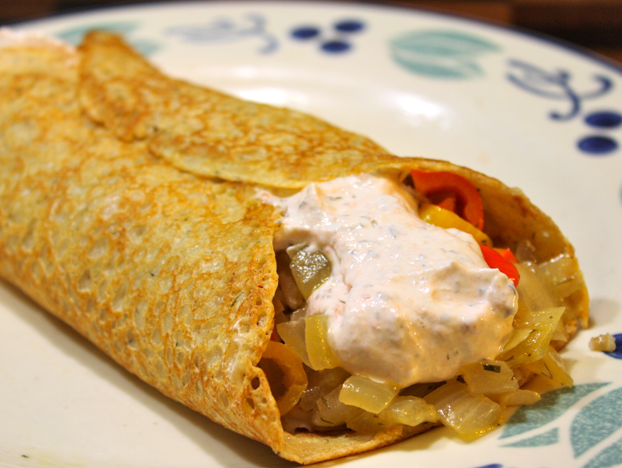 Assemble with grains on first, veggies on grains, top with sauce. Wrap up the crepe and Serve.