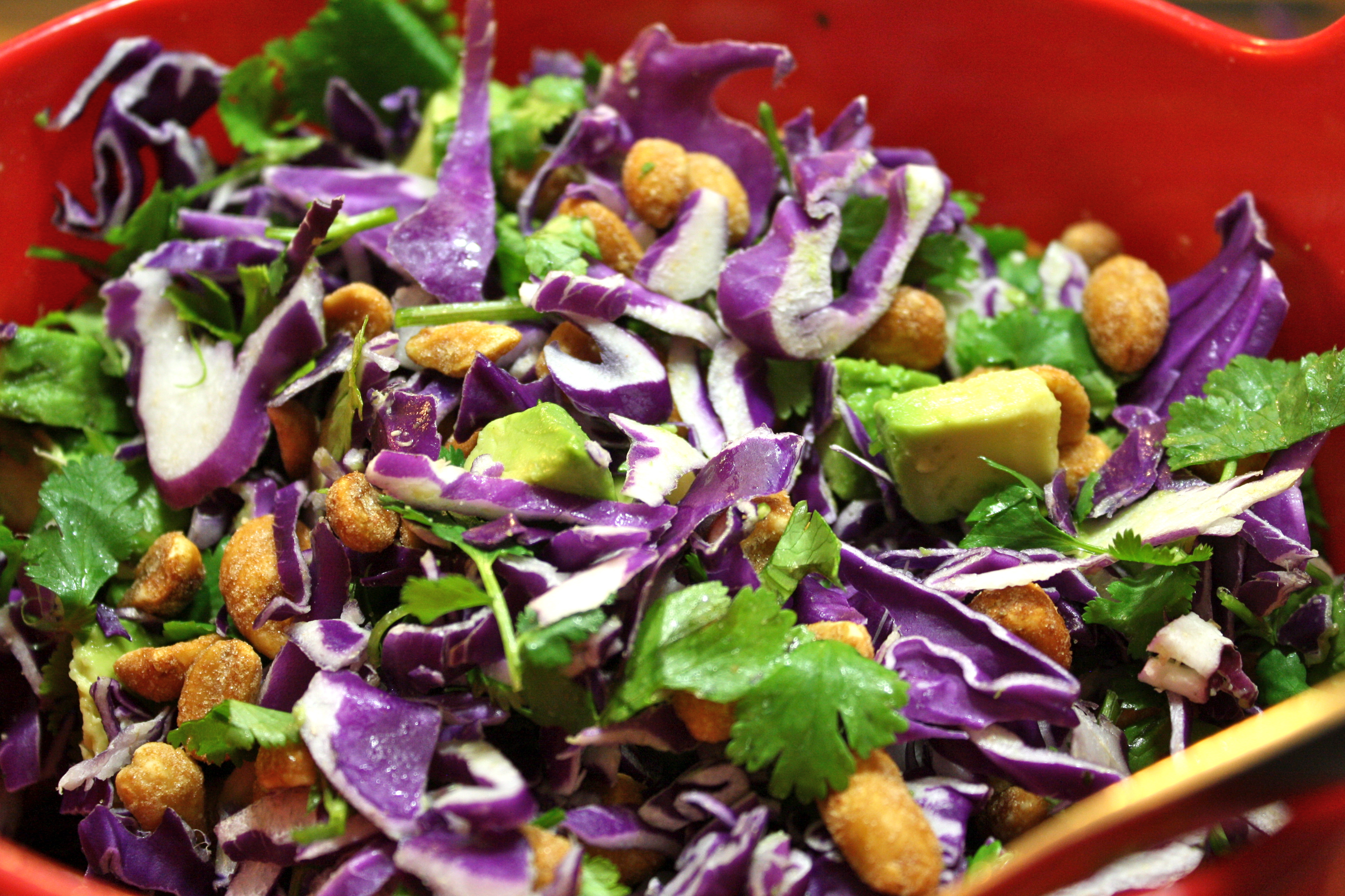 You can make this vegetarian or include a bit of meat if you need to convince the carnivores in your house to give it a try. The roasted sweet potatoes and avocado play off the crunch of the cabbage and peanuts. Add a little spice and tang from the siracha and lime juice…. it just works!