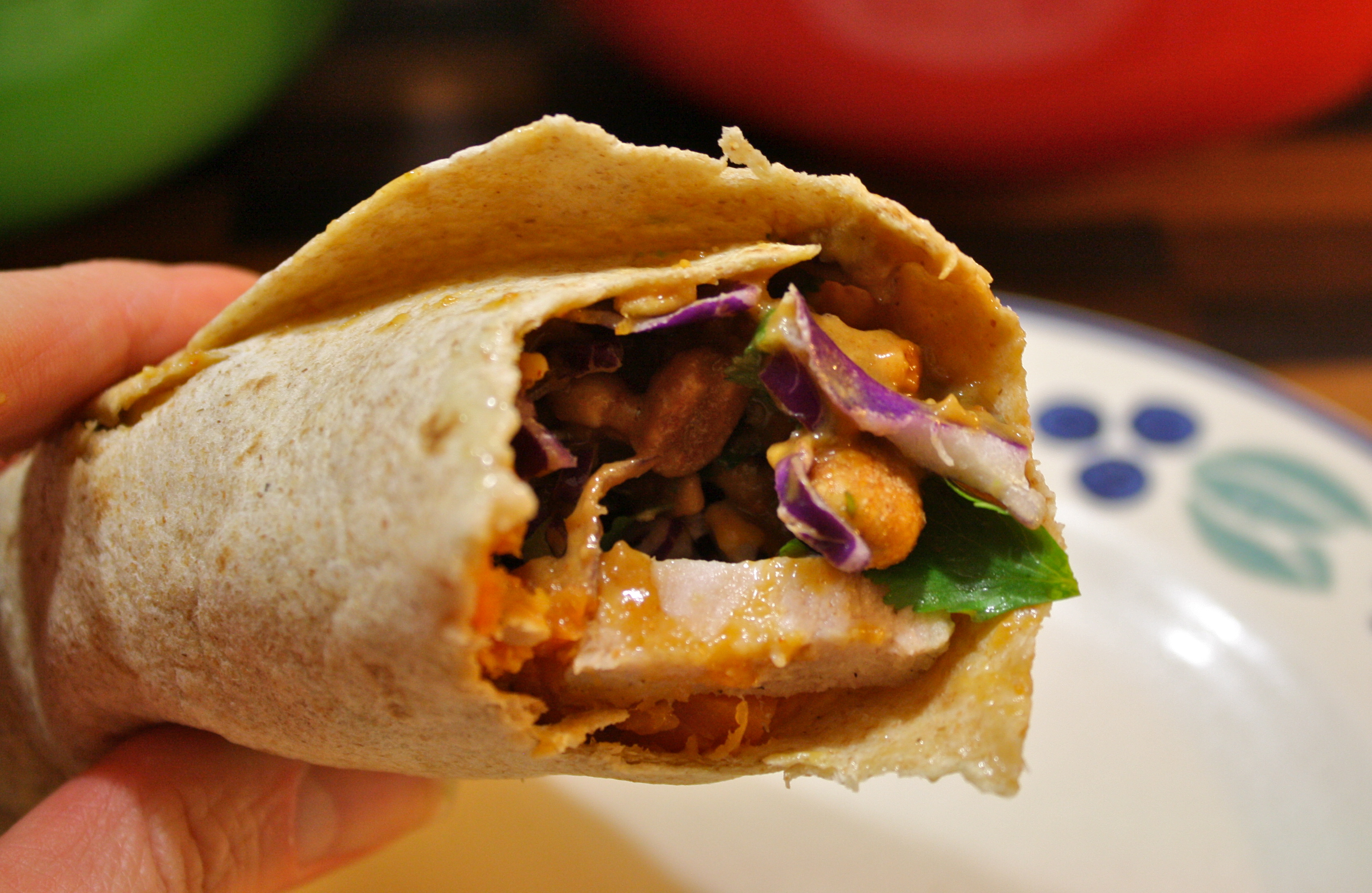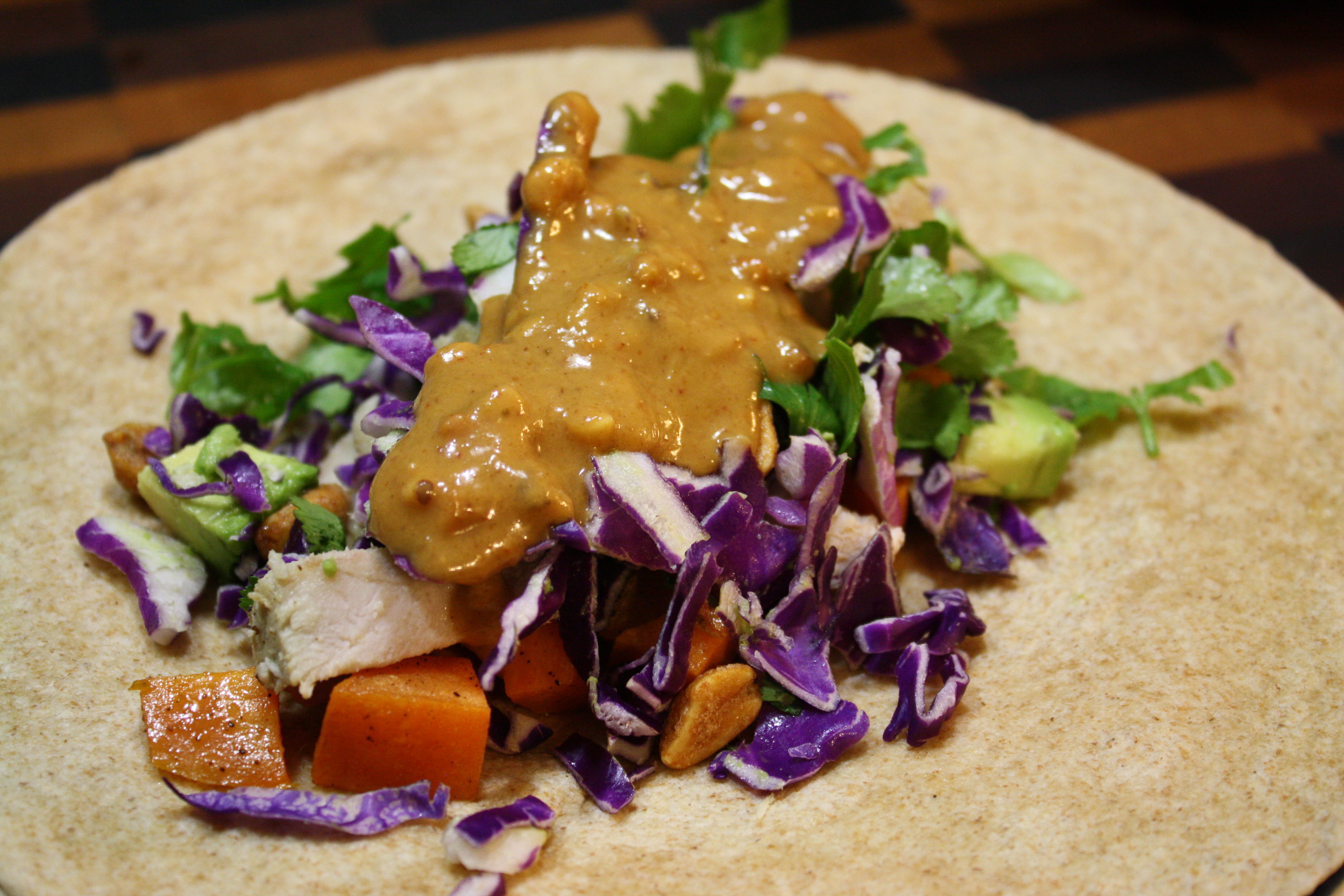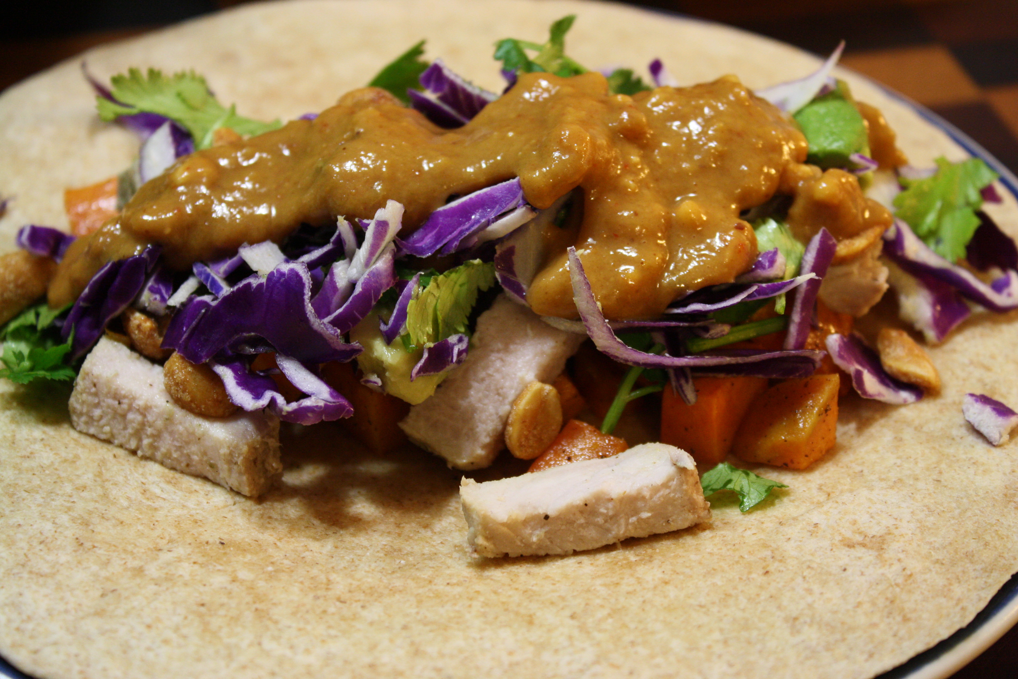 Assemble by dividing the chopped veggies and roasted sweet potatoes among the tortillas. If you want a bit more protein, a bit of cubed pork chops goes really well in this dish. Add the peanut sauce of the top. Roll up and serve.