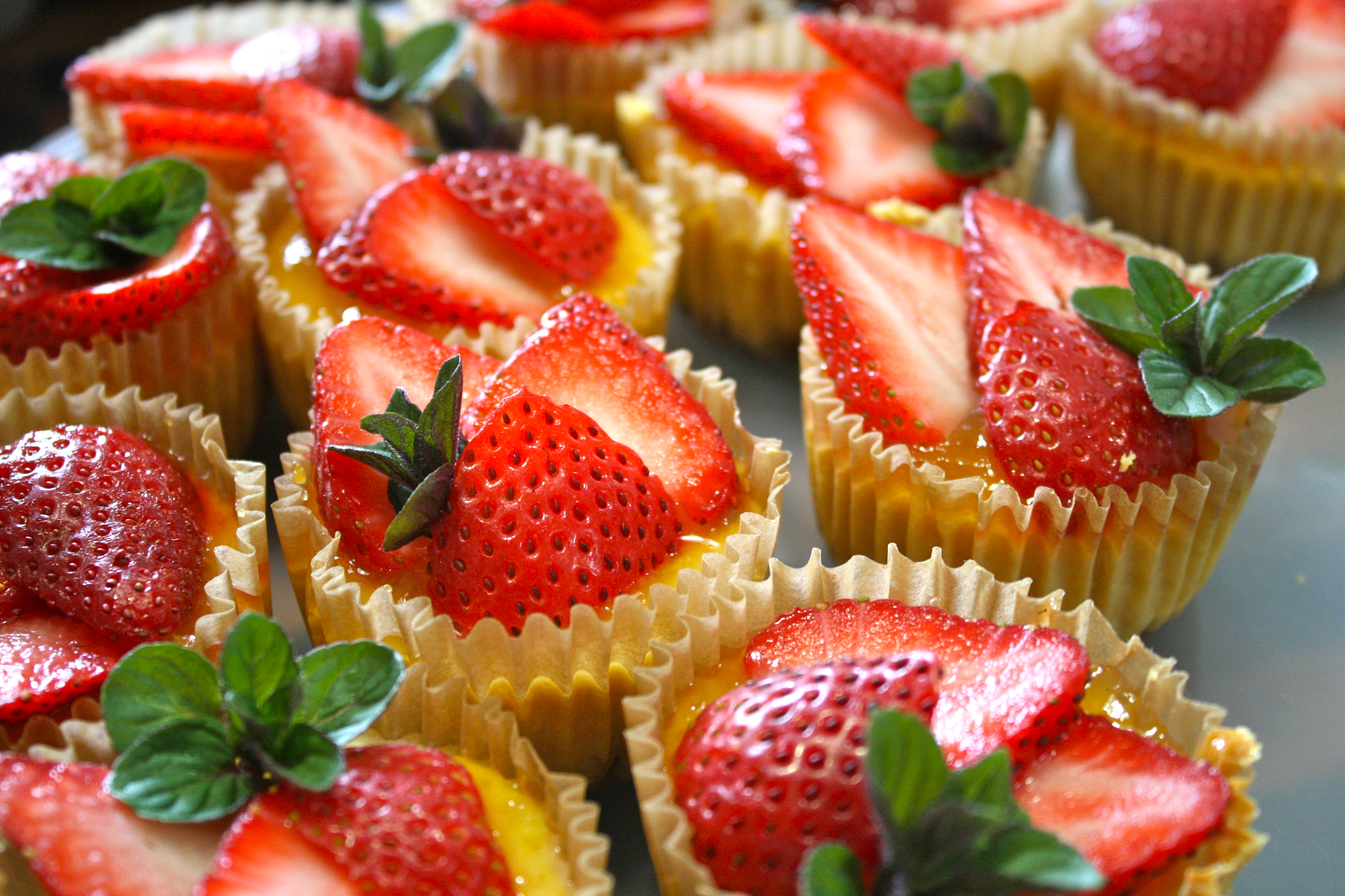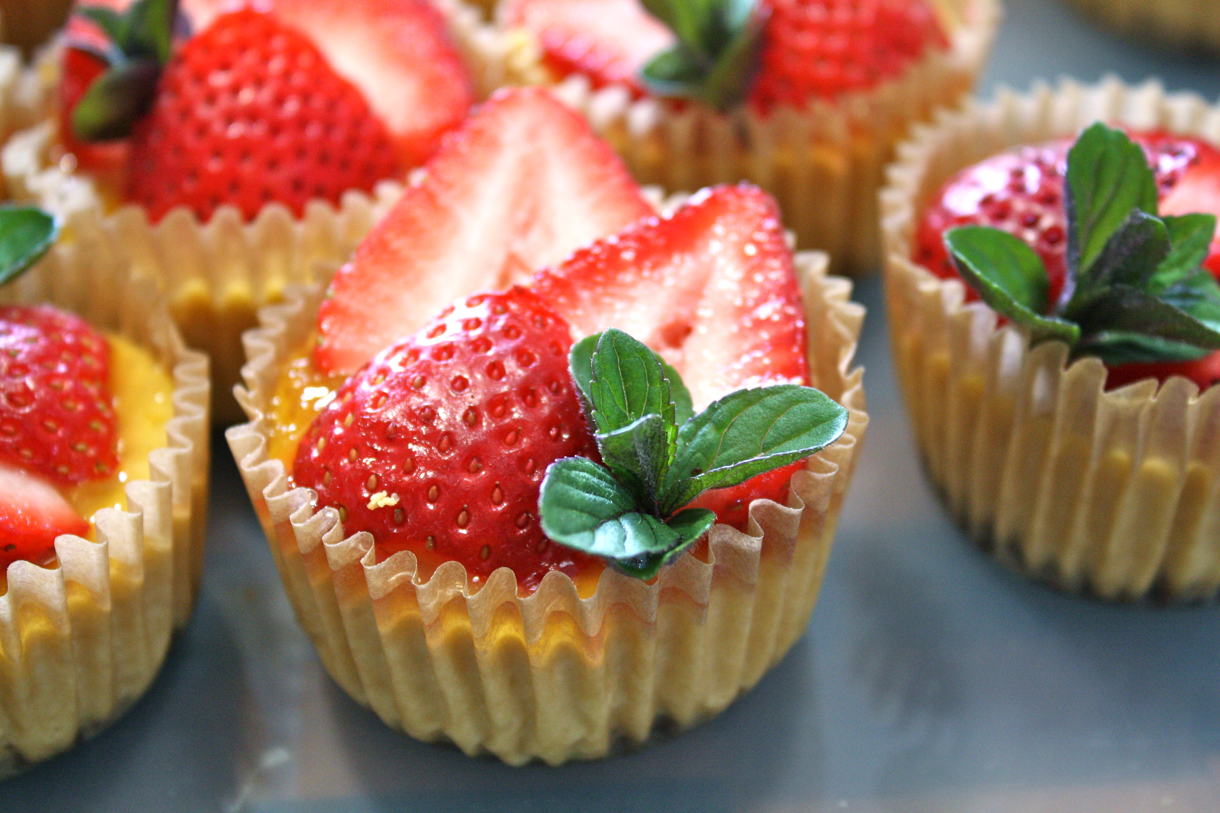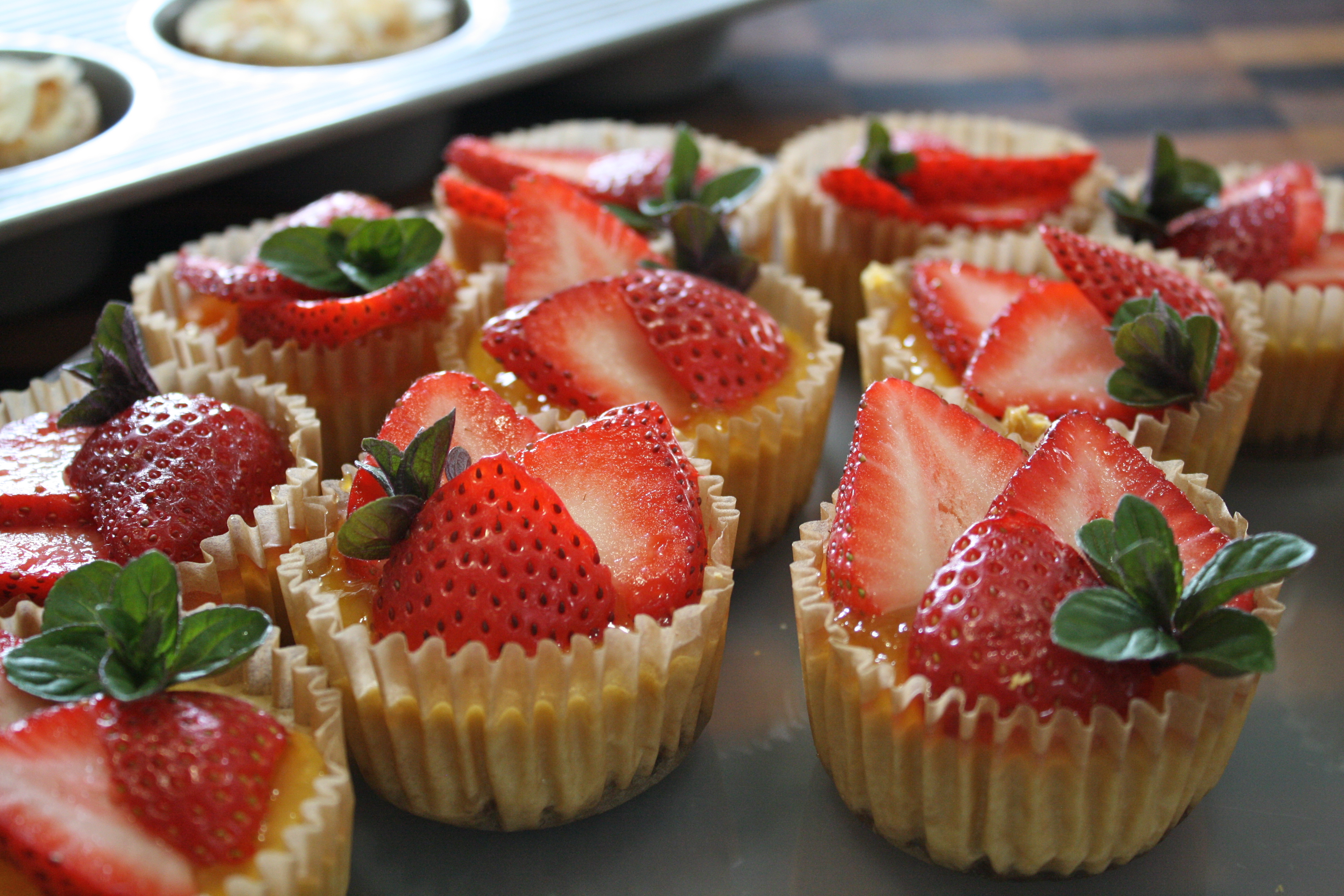 For the plan cheesecakes, top each one with a spoonful of your favorite fruit spread. Slice washed, hulled strawberries into 3-4 pieces. Fan out over the top. Add a sprig of fresh mint if desired.