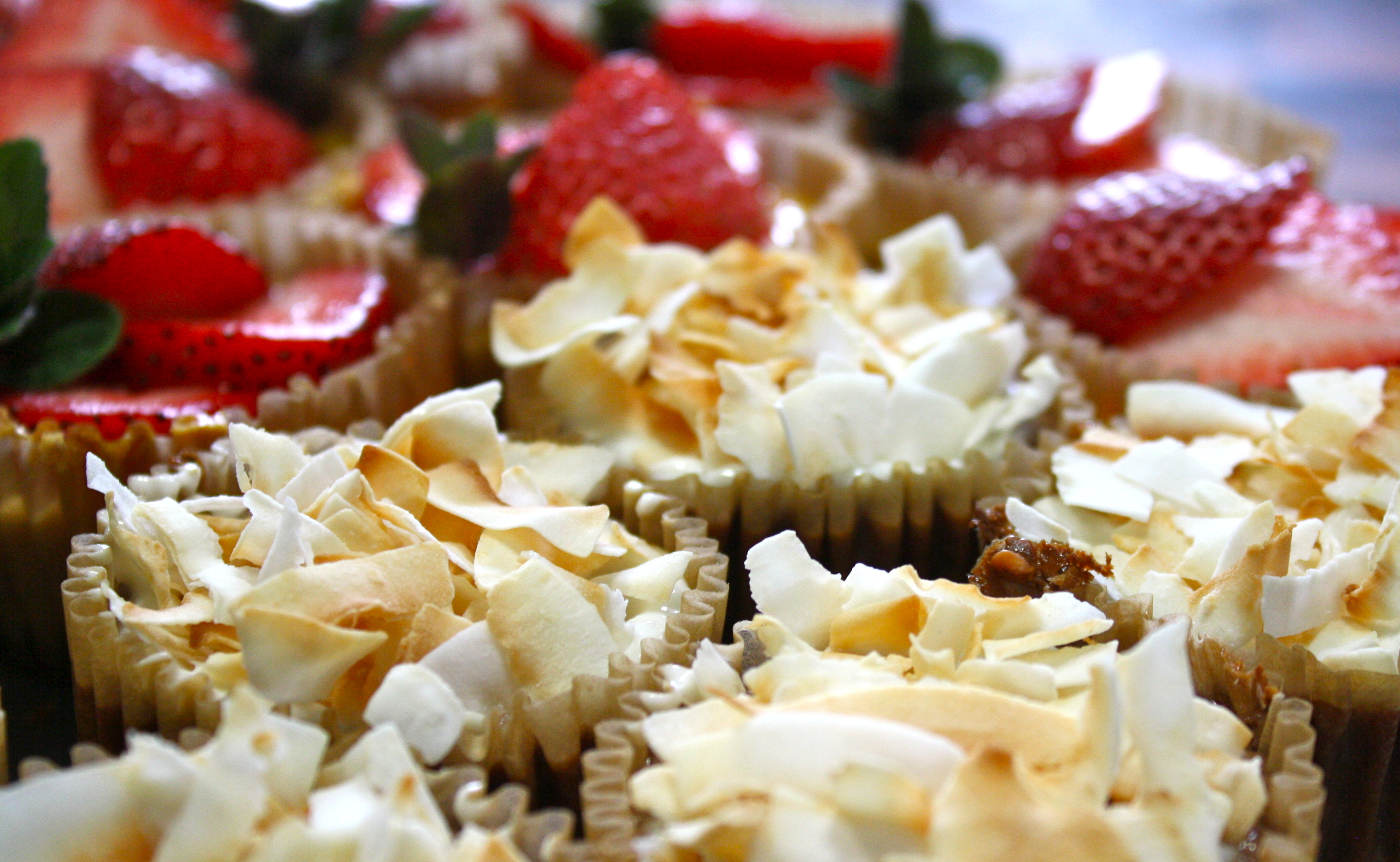 For the chocolate chip cheesecakes. Spread a small amount of vanilla yogurt over the top (helps the coconut flakes to stay in place). Sprinkle with toasted coconut. NOTE: to toast coconut, just spread a cup of coconut flakes on a clean cookie sheet and bake for about 5-10 minutes in the same oven (at 325 F) right after you finish taking the little cheesecakes out. Keep an eye on this. They can go from white to toasted pretty quick!
