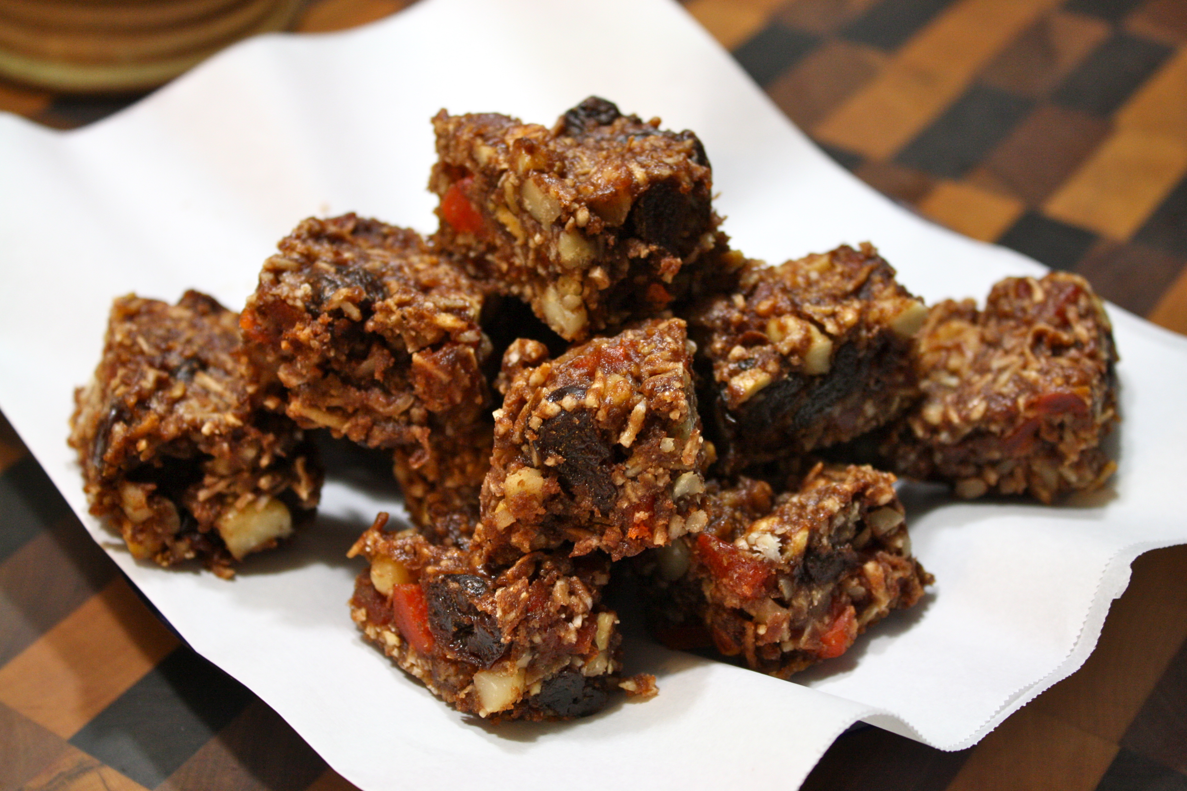 This treat is made with dried fruit….why? More flavor of course and less moisture. Nuts will give a nice crunch in the bite. Dried unsweetened coconut (I’m not into propylene glycol) helps to hold it all together. And of course a bit of chocolate because…..its chocolate! Dark chocolate to give it as much flavor for its small role. I used a fruit spread instead of honey which results in a softer square. Keep these in the refrigerator to keep them firm.