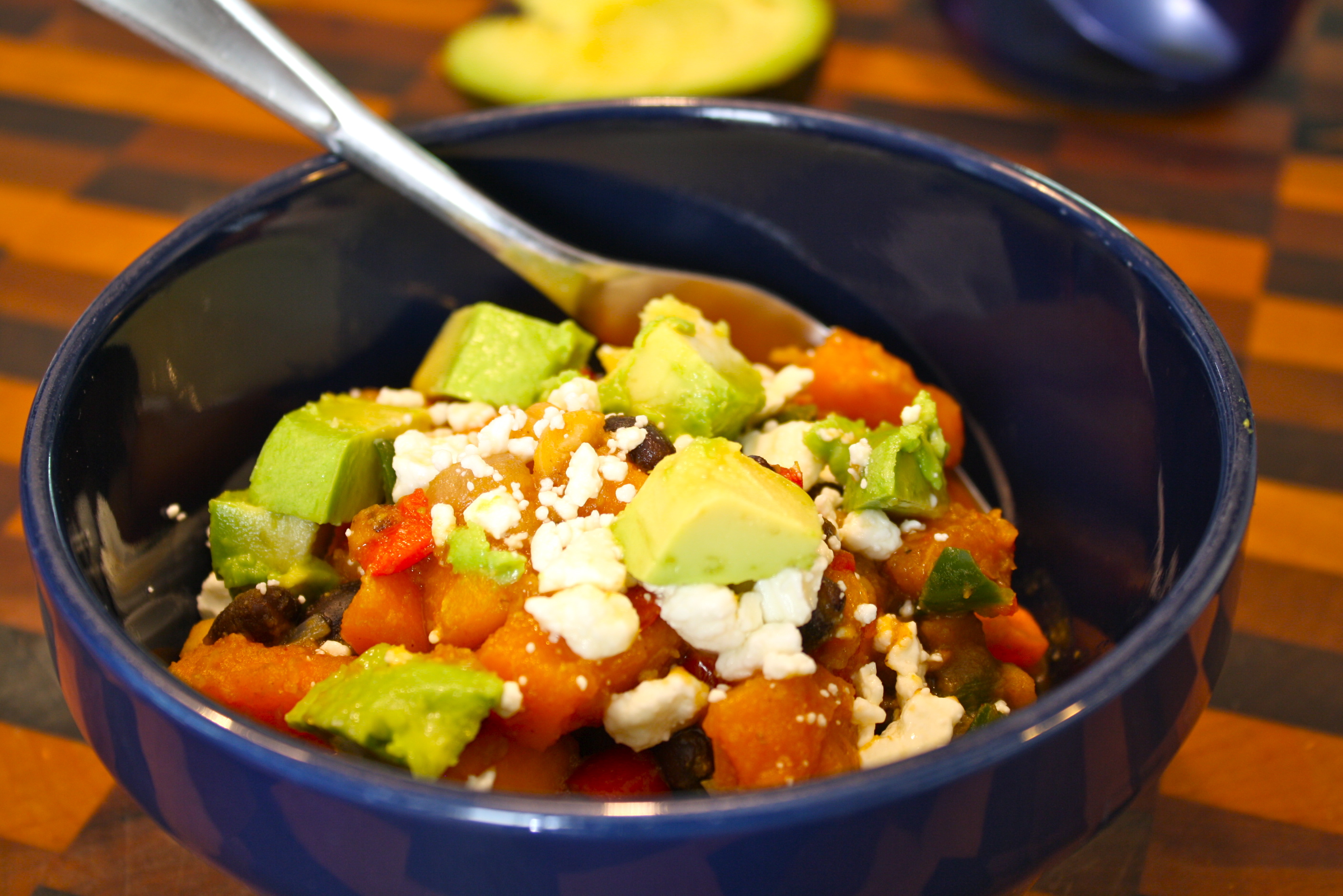 I combine both black beans and chickpeas with sweet potatoes, spicy peppers and yellow onions. Southwest flavors like cumin, coriander, and chipotle along with a topping of fresh avocado and lime juice….sweetened slightly with a bit of coconut sugar. A bit of cotija or feta cheese brings it all home.