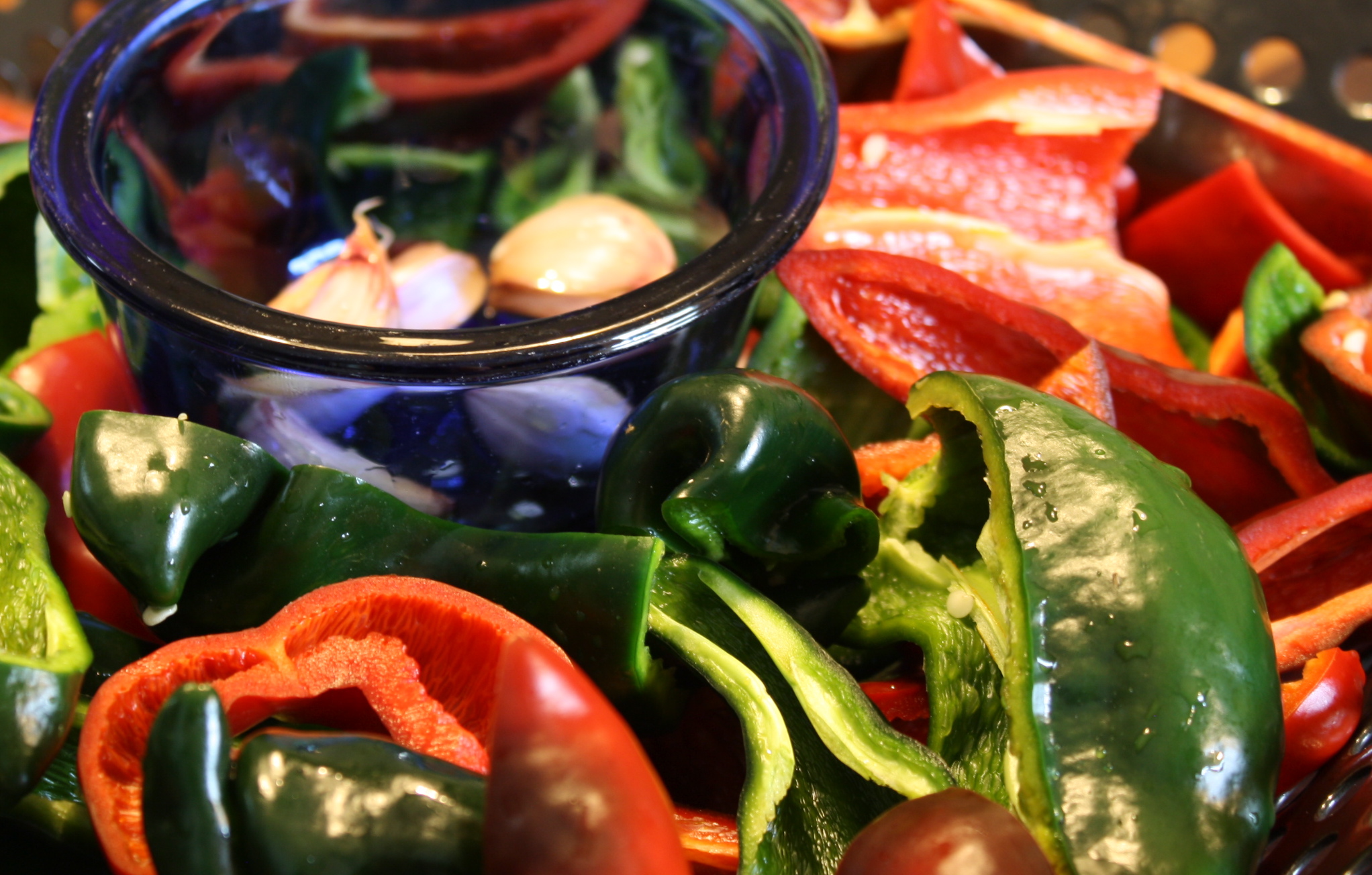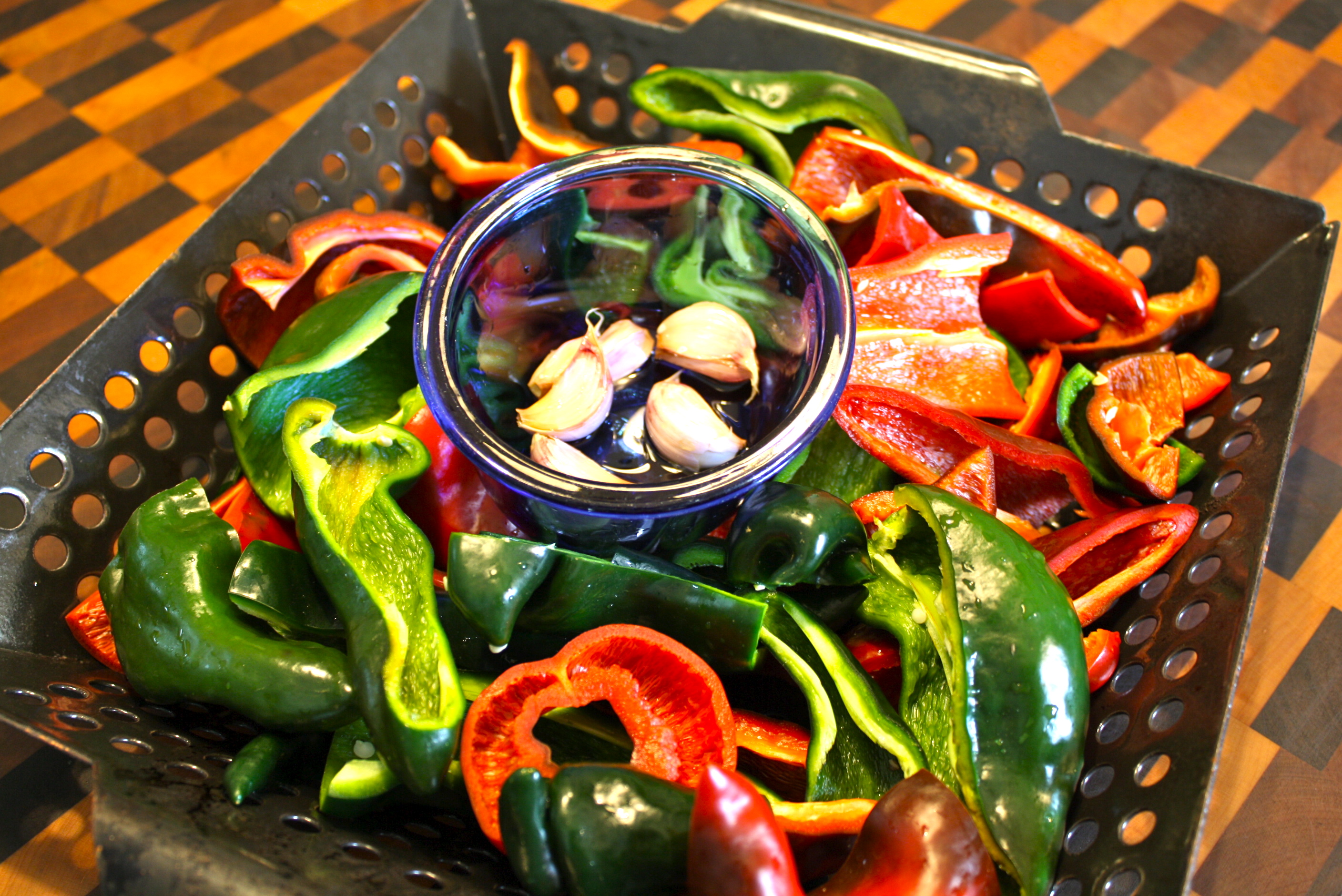 Put prepared peppers in a grill basket. Place garlic in a small ovenproof bowl. Drizzle with olive oil. Set in center of grill basket. Roast (I used my gas grill) at 400 F for 20-25 minutes or until peppers are soft and show some blackening. Remove from heat and allow to cool.