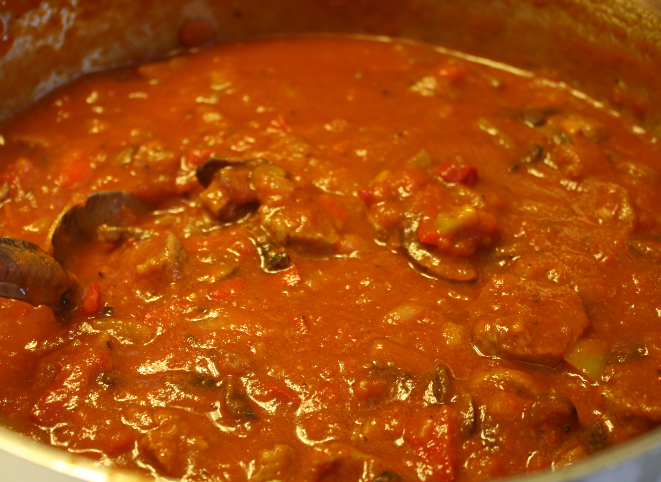 Put the 6 quart pan on the stove and heat it for about 60 secs. Add the olive oil and then the sausage. Break up the sausage as it browns. Add the onions, garlic, peppers and mushrooms when sausage is about half cooked. When onions become translucent and mushrooms begin to yield their liquid, add the wine and seasonings. Let this simmer for about 5 minutes. Add your spaghetti sauce and stir. Heat until bubbling. Turn off heat.