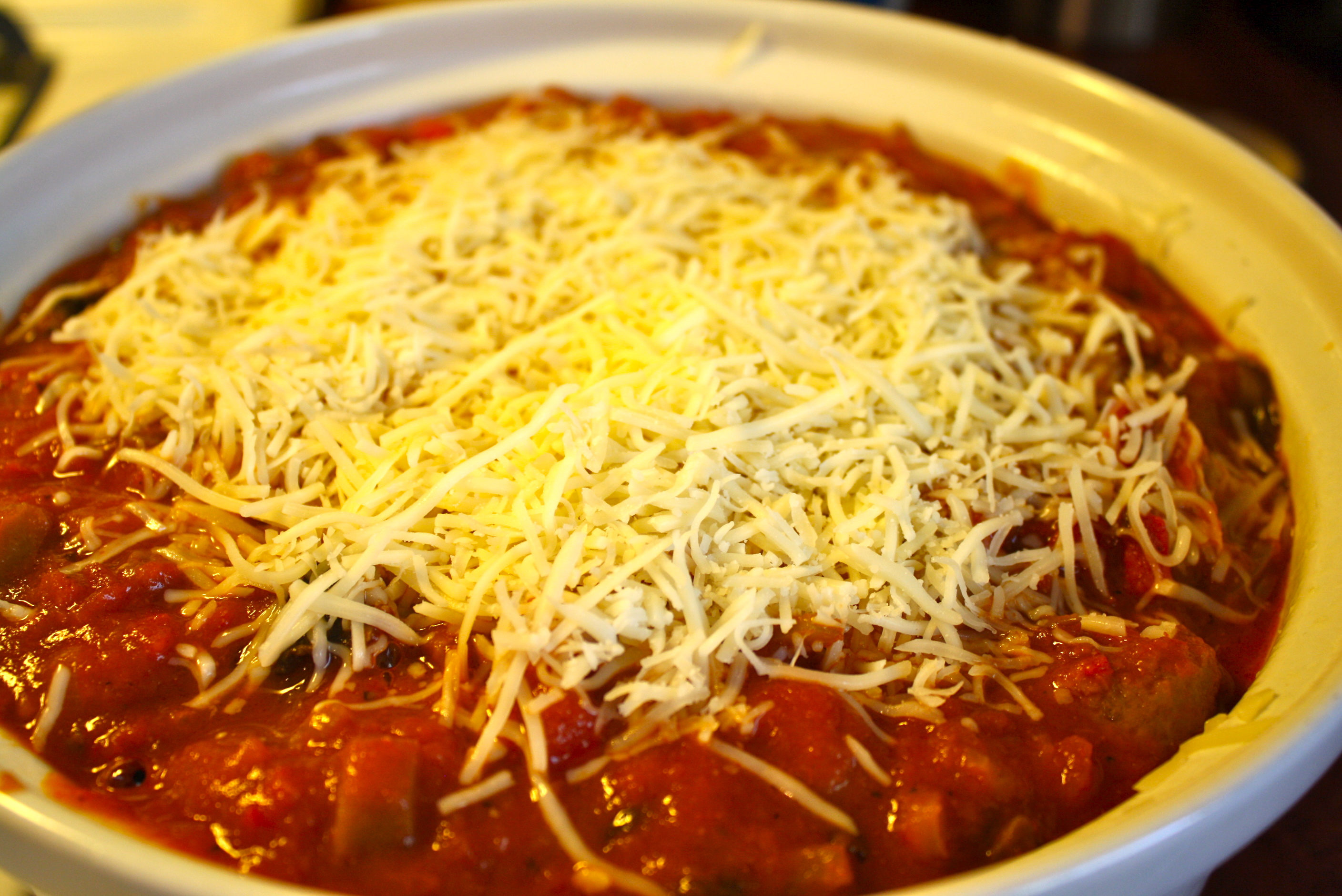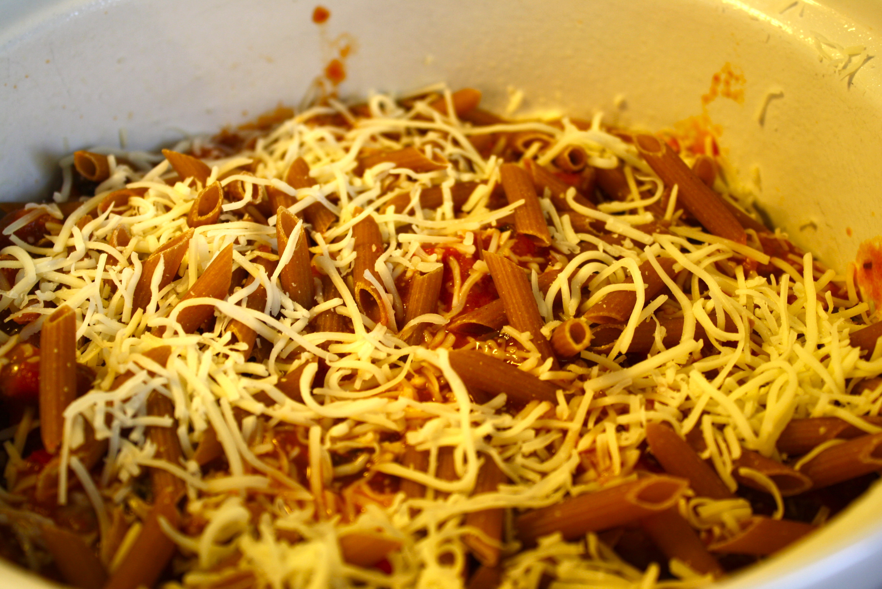 First put down a layer of your sauce mixture, then sprinkle on your uncooked pasta till the sauce is almost completely covered, next sprinkle on about 1/2 cup of the shredded cheese. Repeat until casserole is almost full. Your top layer should be sauce, pasta, sauce and last cheese.