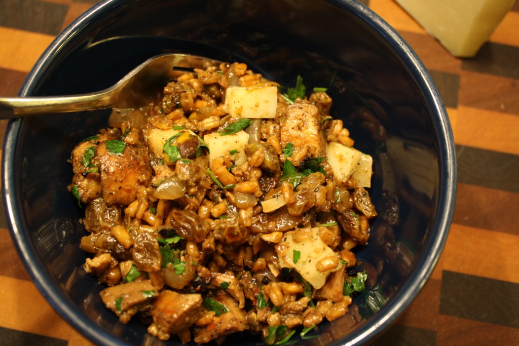 When the farro is almost cooked, add it and remaining liquid to the chicken mixture. Reduce the heat and allow everything to blend while the remaining liquid is reduced. Taste, add salt and pepper if desired. Add manchego and parsley. Stir everything together. Serve with a drizzle of good balsamic before serving. Enjoy!