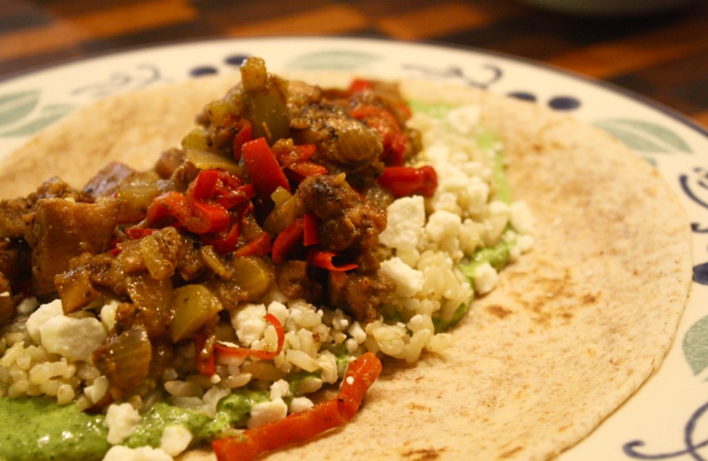 To assemble: On the warmed tortilla, spread the pesto, top with rice, then cheese followed by the chicken mixture. Fold up the tortilla and eat with gusto! Enjoy!
