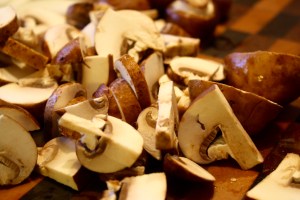 Heat a large stock pan over medium high heat for 3-4 minutes. Add olive oil and red pepper flakes. Add mushrooms and saute over high heat until moisture is driven off and mushrooms are nicely browned. (remove them from the pan) Add onion and lower heat to medium. Cook until translucent and collapsed, about 5 minutes. Add chopped peppers and garlic. Continue to cook at medium heat for another minute or two.