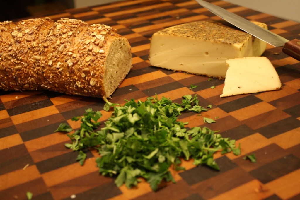 Remove the casings from the sausage. Drain and rinse the beans. Chop the parsley. Slice the bread and cheese.