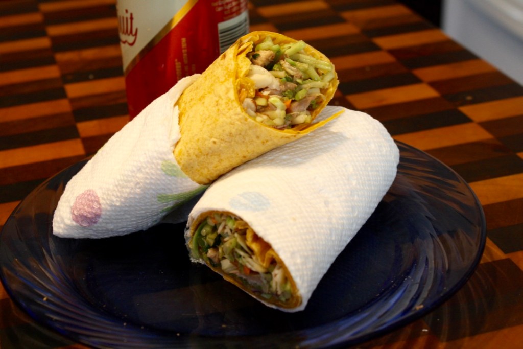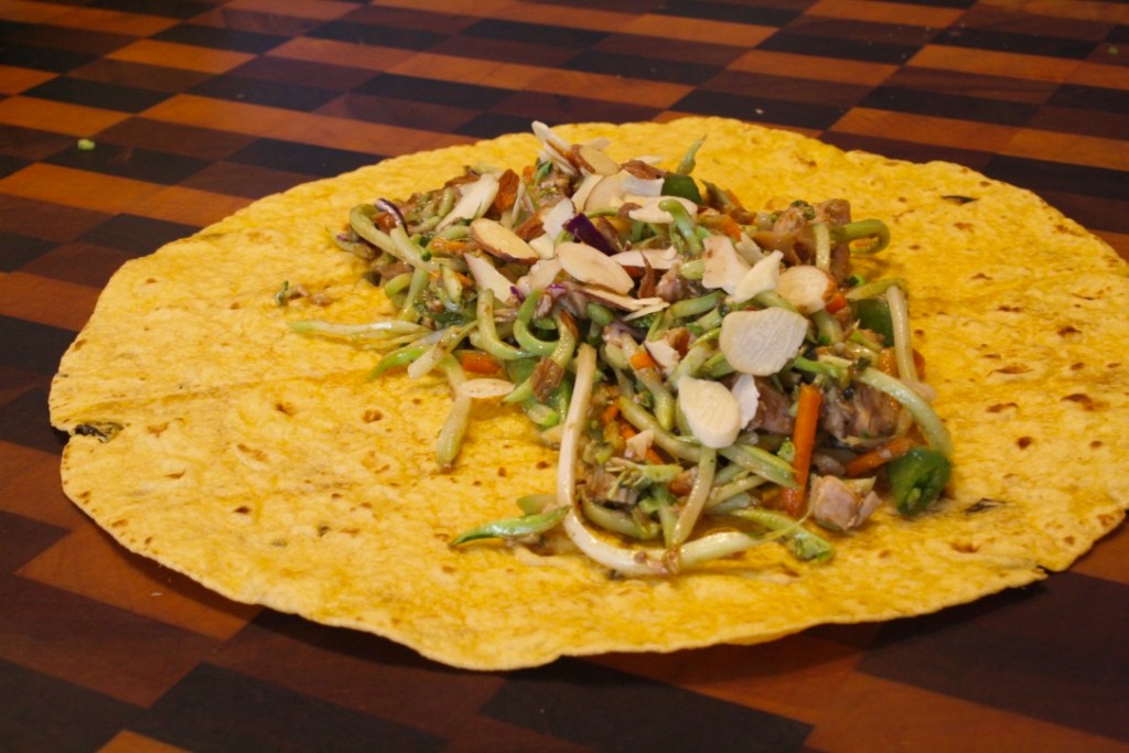 Heat your wraps for about 15 seconds in the microwave to improve their pliability. Spoon the mix down the center line and sprinkle generously with the sliced almonds. Fold over the ends and roll up the wrap. Cut in half and serve with a cold drink. Enjoy!