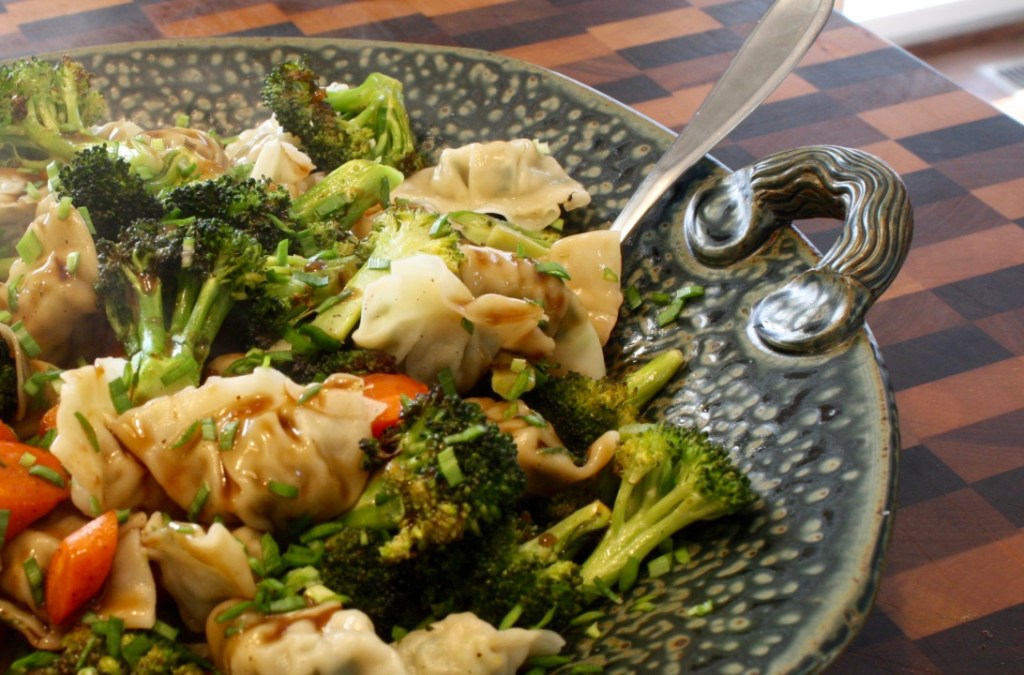 Mini wontons make great appetizers! I decided to make them into a meal! No-not just eat the whole bag. 😦 Build a meal around the wontons. I found a chicken and cilantro mini wonton at Costco that is pretty tasty. I combine it with roasted broccoli and mature carrots. Top it with a thickened ponzu and garlic chives and I scored a 9.5 from my eldest son (who was thoroughly skeptical of this meal when I described it). Ian sets a high bar when it comes to food, so I feel pretty good right now. 🙂