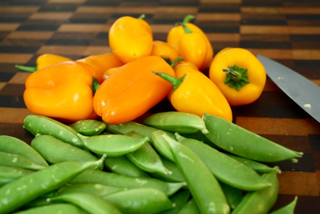 I make couscous with chicken stock. Doesn’t take long to bring a can of stock to boil (2-4 minutes). One minute of cook time and then off goes the stove. 🙂 I use fresh sweet peppers and sugar snap peas. No cooking. They are cool, sweet, and crunchy.