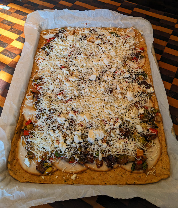 To the prepared dough, add a layer of the deli meat, overlapping slightly. Now spoon the cooled vegetable filling over the deli meat, Sprinkle with mozzarella and feta.