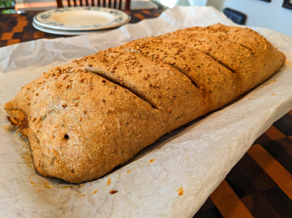 Using the parchment paper to pick up the filling laden dough, the Stromboli was rolled up “jelly roll” style and the ends were pinched together to seal in the filling. Place Stromboli on parchment paper in middle of pan.. Three slits were made through the top of the rolled dough to allow steam to escape. I like to brush it with an egg wash and sprinkle with sesame seeds (optional).
