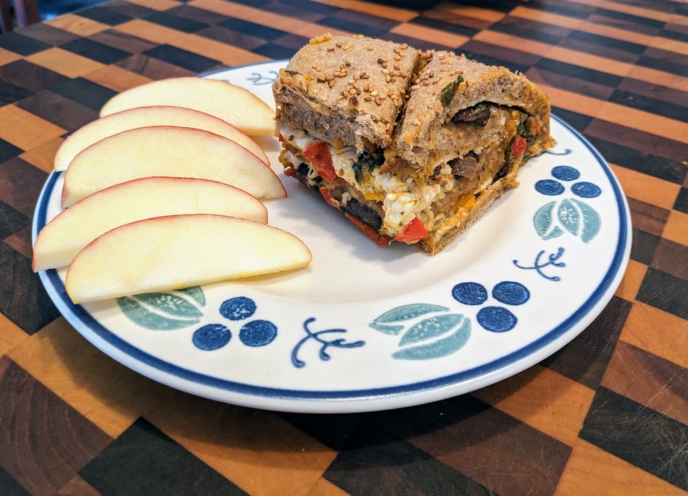 Heat the skillet on high for about a minute, add ghee and let it melt or use olive oil. Sprinkle your pepper flakes into the oil. Immediately add your mushrooms to the pan and spread them out to get maximum contact with the skillet surface. Do NOT STIR! Not yet.. Mushrooms are mainly water. The high heat helps to drive of the moisture and lets the mushrooms brown beautifully. Let them cook unmoved for about 2-5 minutes and check the underside of the mushrooms for browning. If you have it, give it all a good stir and let them brown some more. They will reduce in size quite a bit. Now you can reduce the heat to medium-low and add your onions. Onions cooked over a lower heat will give you a wonderful sweetness. Once the onions are translucent and are beginning to brown, add your peppers and salami. Once the salami starts to render, add your oregano, basil and tomato jam or tomato paste. Give it a good stir and cook for 3-5 minutes. This time of year my lemon sorrel is already up and ready to use. Add the sorrel or spinach if using along with the balsamic. Give another good stir and let the greens collapse and balsamic coat everything. Taste the filling and add salt and fresh ground black pepper to taste (remember the cheese will also add salt) Turn off the heat and allowed to cool.
